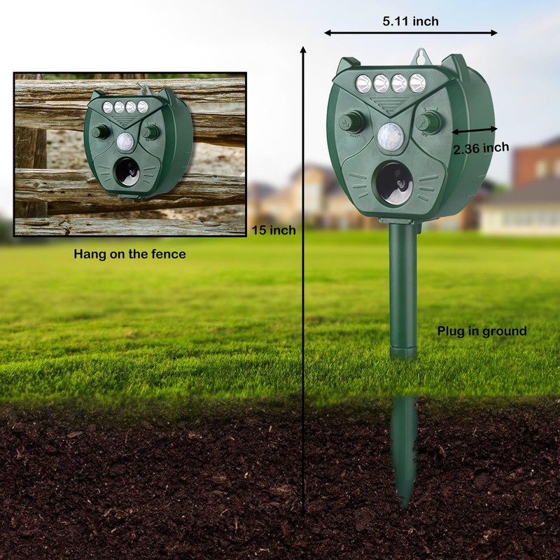 - Easy to install and use: For the first time, charge the solar panel in direct sunlight for 2 days. After assembling the ultrasonic repellent, insert it into an area that is frequently disturbed by animals and has enough direct sunlight to keep the battery fully charged, preferably about 9-10 inches off the ground. It is also designed with 2 hanging holes, which can be hung on trees, fences