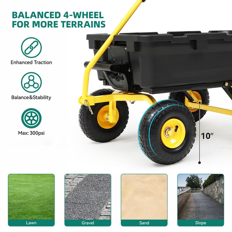 - 10" Pneumatic Tires for Various Terrains: The balanced 4 - wheel design with 10" pneumatic tires provides exceptional traction and stability on lawns, sand, snow, gravel and more. This utility cart can handle different terrains effortlessly.