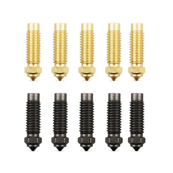 - Package Contents: 5 0.4mm brass nozzles + 5 0.4mm hardened steel nozzles, M6 spiral pattern on the outside, easy to install