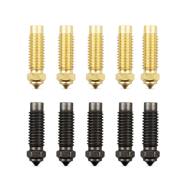 Package Contents: 5 0.4mm brass nozzles + 5 0.4mm hardened steel nozzles, M6 spiral pattern on the outside, easy to install