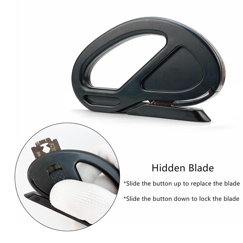 All these wrapping paper knives are designed with hidden blades, avoiding exposed blades. The blades are sharp enough to make the cutting process prefect, and are easy to replace. The black safety cutter locks or release the blade by sliding button, while the orange paper cutter blade is tightly locked by embedded.