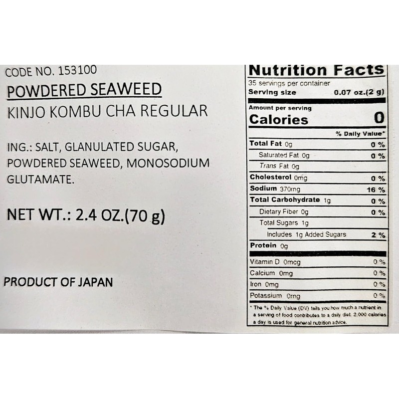 - QUALITY INGREDIENTS: Salt, Granulated Sugar, Powdered Seaweed, and Monosodium Glutamate. Each 2.4oz (70g) container of powdered tea mix has approximately 35 servings. Whether as a soothing tea or an umami-rich seasoning, let this jar of joy infuse your life with flavor and a boost wellness.