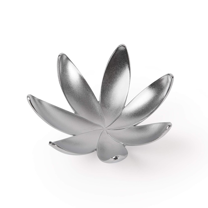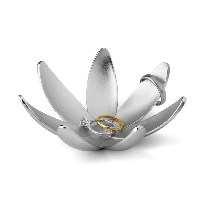 Magnolia flower-shaped ring dish by Umbra safely and conveniently stores rings or other small treasures. Constructed of die-cast zinc with textured two tone/polished finish and chrome plated . Rings can be stored on the "petals" or in the center of the dish. Great by the bed or sink. Measures 4-1/4 Inch in diameter by 1-1/2 inch tall. Designed by Alan Wisniewski for Umbra - the worldwide leader in innovative, modern, casual and affordable design for the home.