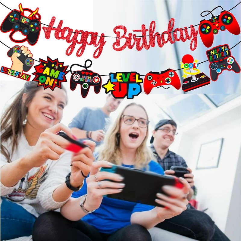 - 【Appealing video game birthday decorations】A bright red happy birthday sign banner looks even more eye-catching with a game theme cutout banner in red. Hang it up to instantly ignite the passionate atmosphere of a gaming birthday party.