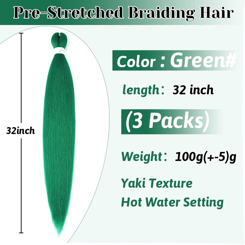 Umylar Green Braiding Hair Extensions 32 '' Pre stretched Braiding Hair Hot Water Setting Synthetic Hair Pre Stretched Crochet Braids Hair(3 Packs,Green#)