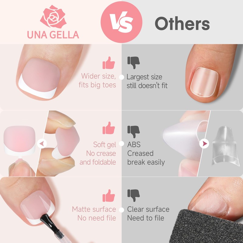 - đź’—Natural EXtra Thin Toe Nail Press Ons: Made with ultra-thin and comfortable soft gel material, these gel nail tips possess outstanding flexibility and durability, allowing easy bending without causing cracks or marks. With Excellent Fit,these soft gel nail tips present your toenails with a natural and flawless appearance