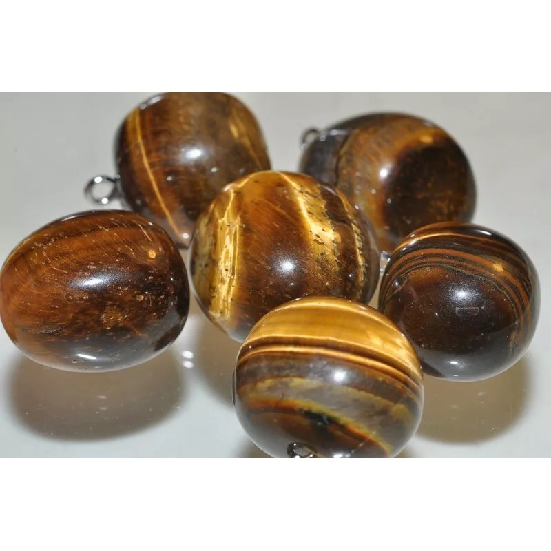 Tiger Eye is quartz with rich alternating yellow and brown stripes due to presence of iron oxides. It contains oriented fibers of Crocidolite (a mineral of the amphibole group) that have been replaced by silica. With its strong chatoyance, the gemstone gets its name from its resemblance to the eyes of a tiger.