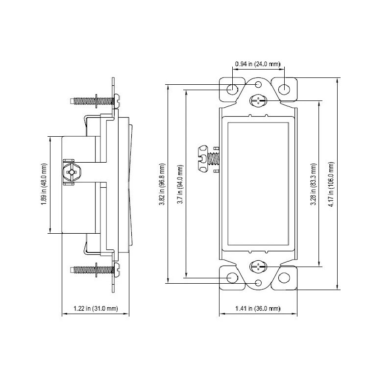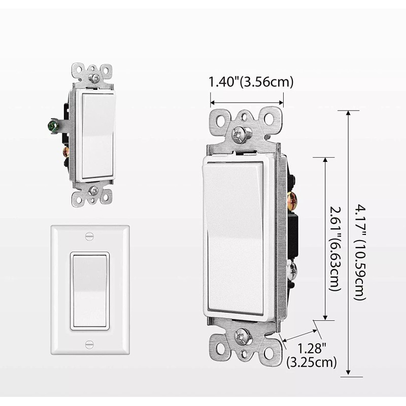 x 1.07” depth; 15A, 120V , 277W, single pole or 3-way break-off plaster ears with grounding screw. |