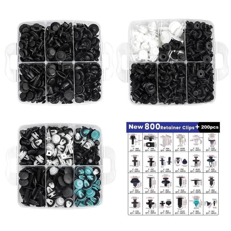 - UNIVERSAL AUTOMOTIVE CLIPS KIT: 1000 PCS great assortment push retainer kit including 24 most popular sizes, 4 different kinds tools with 1 Blue Fastener Remover, fitting for door trim, radiator shield yoke, fender, bumper, side skirt, grille, engine cover and splash shield retainers replacement