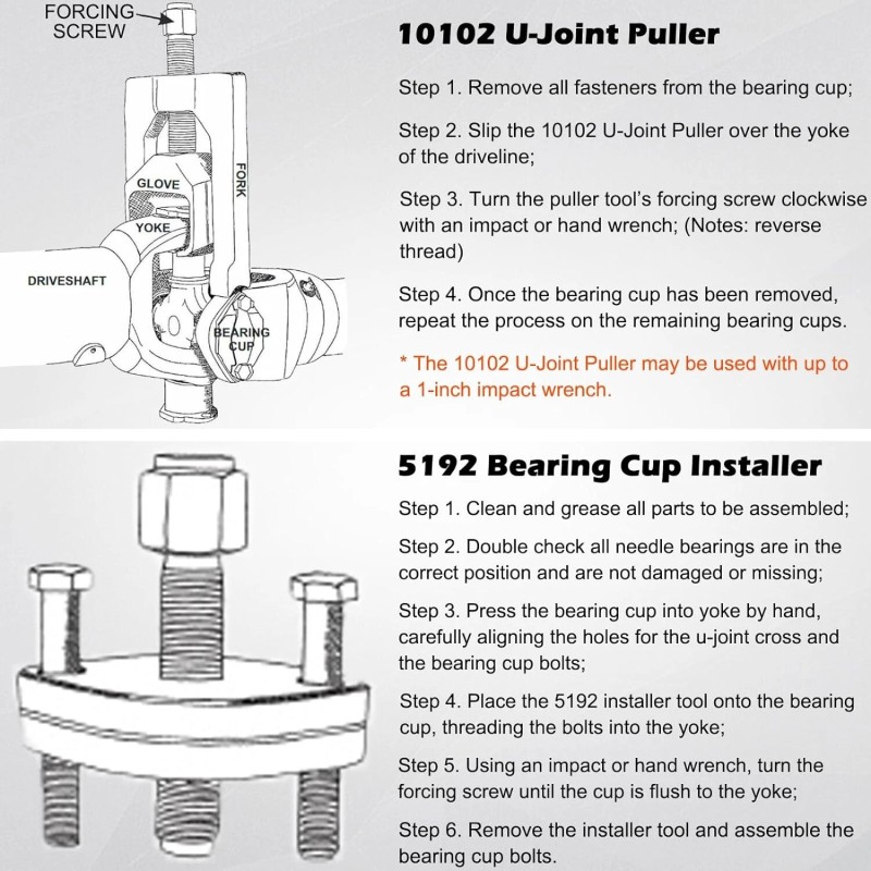 • 【10102 U Joint Puller Tool】Specially designed to help you easily & quickly remove the seized u joints from the driveshaft without damage to the driveshaft, yokes, joints and bearing caps. Used with a ratchet wrench or impact wrench, No required heating or hammering. It's far better than trying to beat the u-joints out with a vice, socket and ball peen hammer.