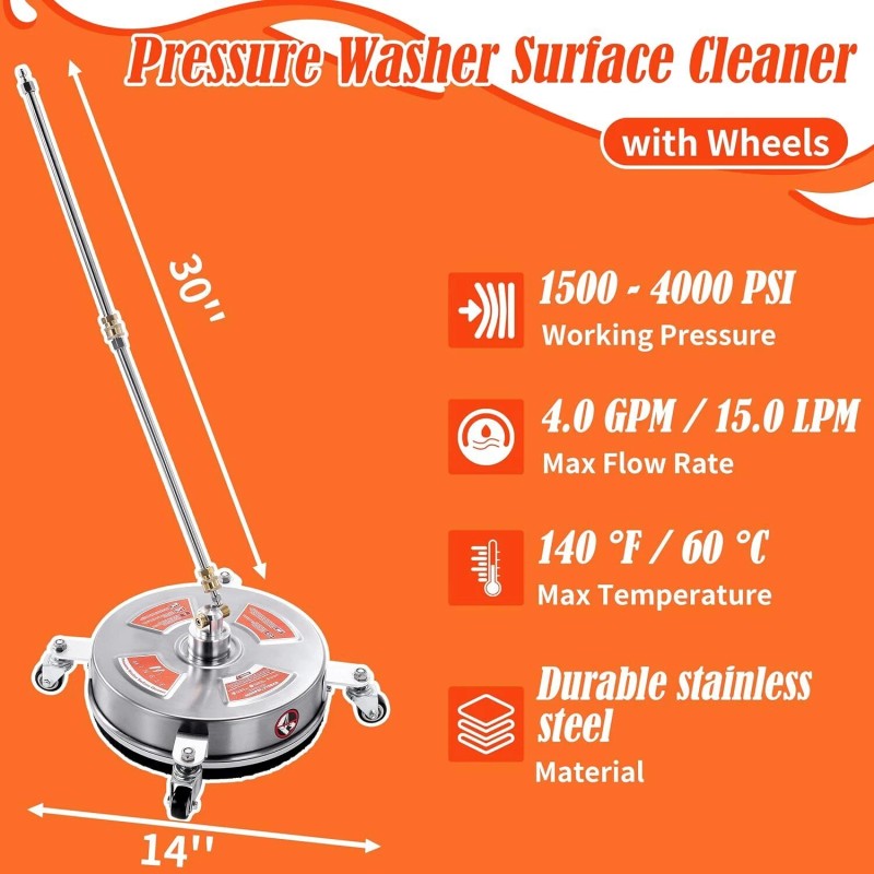 【Package include】14 inch pressure washer surface cleaner with wheels x1, pressure washer extension wand x2, replacement nozzles x2, O-rings x4. Working pressure is up to 4000 PSI. Max flow rate 4.0 GPM.