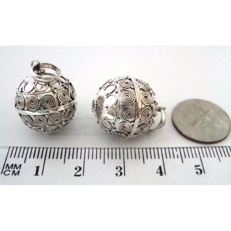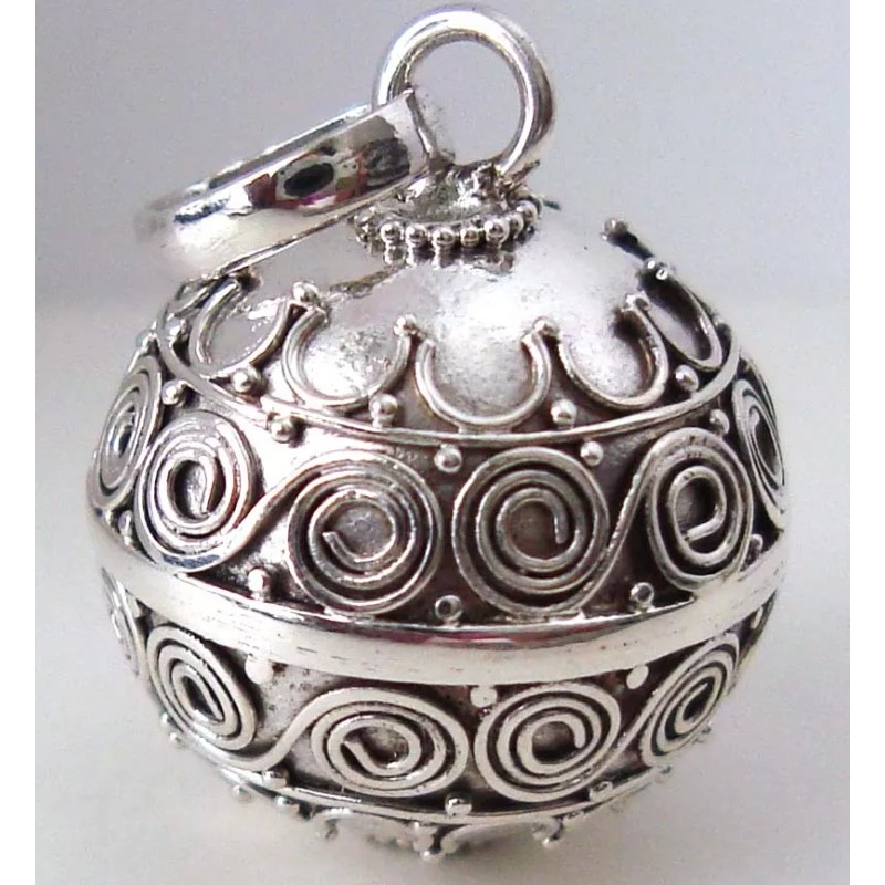 | Description: Bali small Music sterling silver harmony ball Bell pendant When move the pendant, it makes a soft chime sound. Sku: hm55 Quantity: 1 pendant Dimension w/o bail: 14mm x 14mm - small size Dimension with bail: 19mm x 14mm |