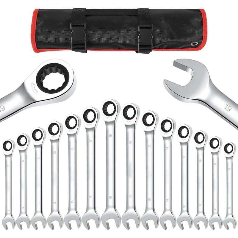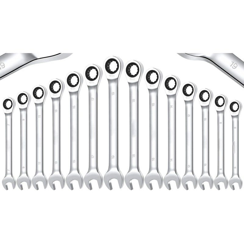 【14pcs Metric Ratchet Wrenches Set】The combination ratchet wrenches set include 6mm, 7mm, 8mm, 9mm, 10mm, 11mm, 12mm, 13mm, 14mm, 15mm,16mm, 17mm, 18mm, 19mm. No-Skip sizing, always have the size you need.