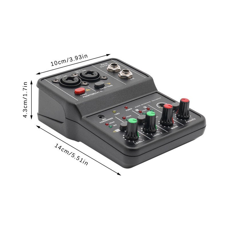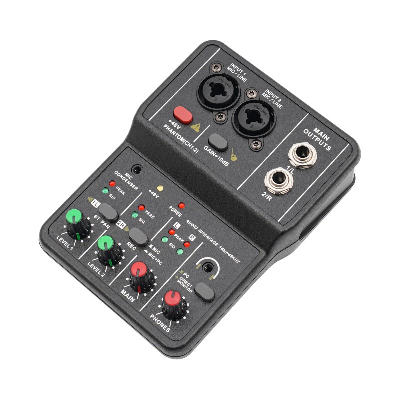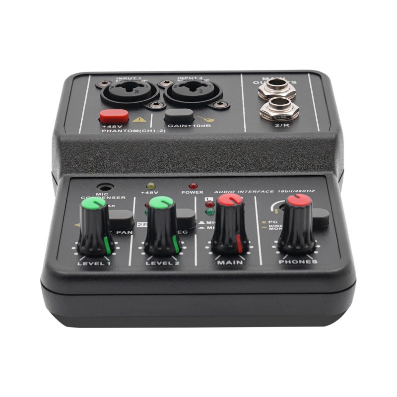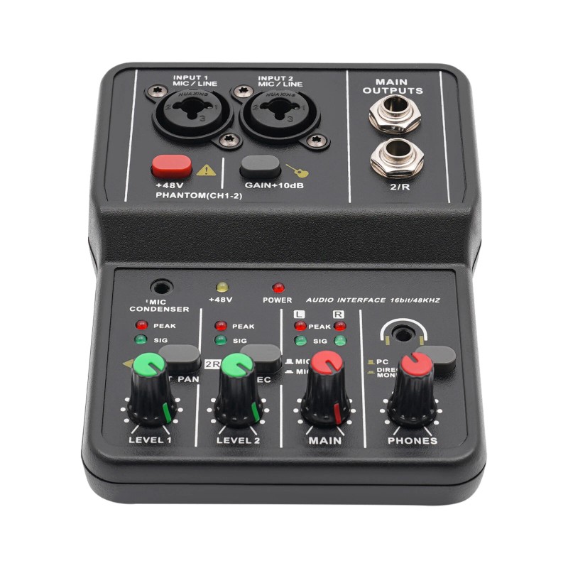 2-channel Mixer: It comes with two microphone line audio instrument jacks and a pair of main outputs for fine processing of various audio signals for great sound quality. The finely crafted jacks allow for tighter microphone connections and more stable inputs.