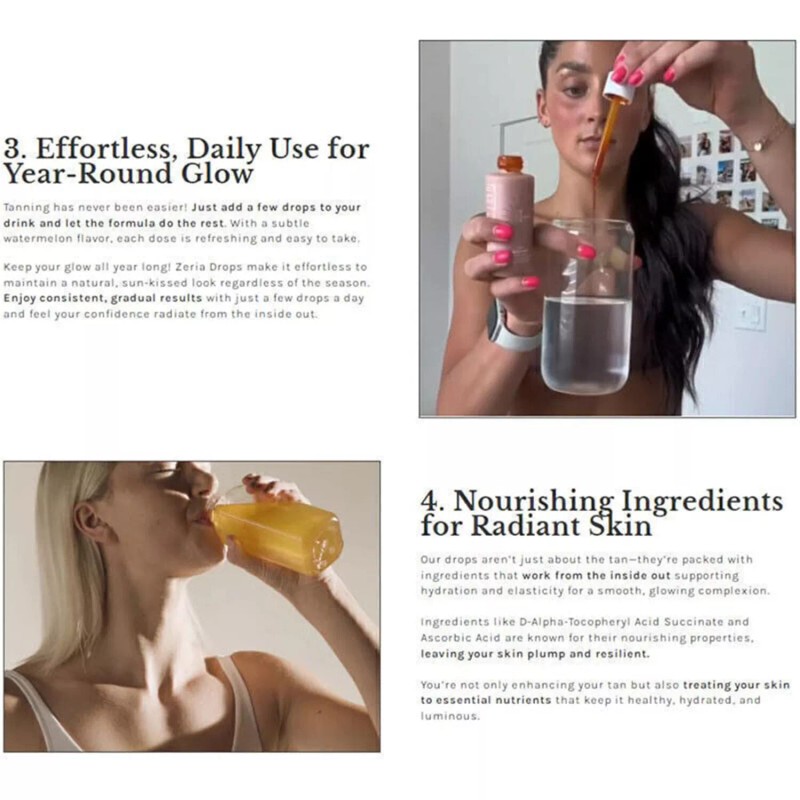 【Natural Sun-Kissed Glow, No Sun Needed】: Tired of the risks and time commitment that come with tanning beds and sun exposure? Zeria Drops give you that gorgeous, sun-kissed glow without exposing your skin to harmful UV rays. Crafted to boost melanin, enhancing your natural skin tone for a genuine, sun-kissed glow. Want a deeper tan? Just add more drops to reach your ideal shade!