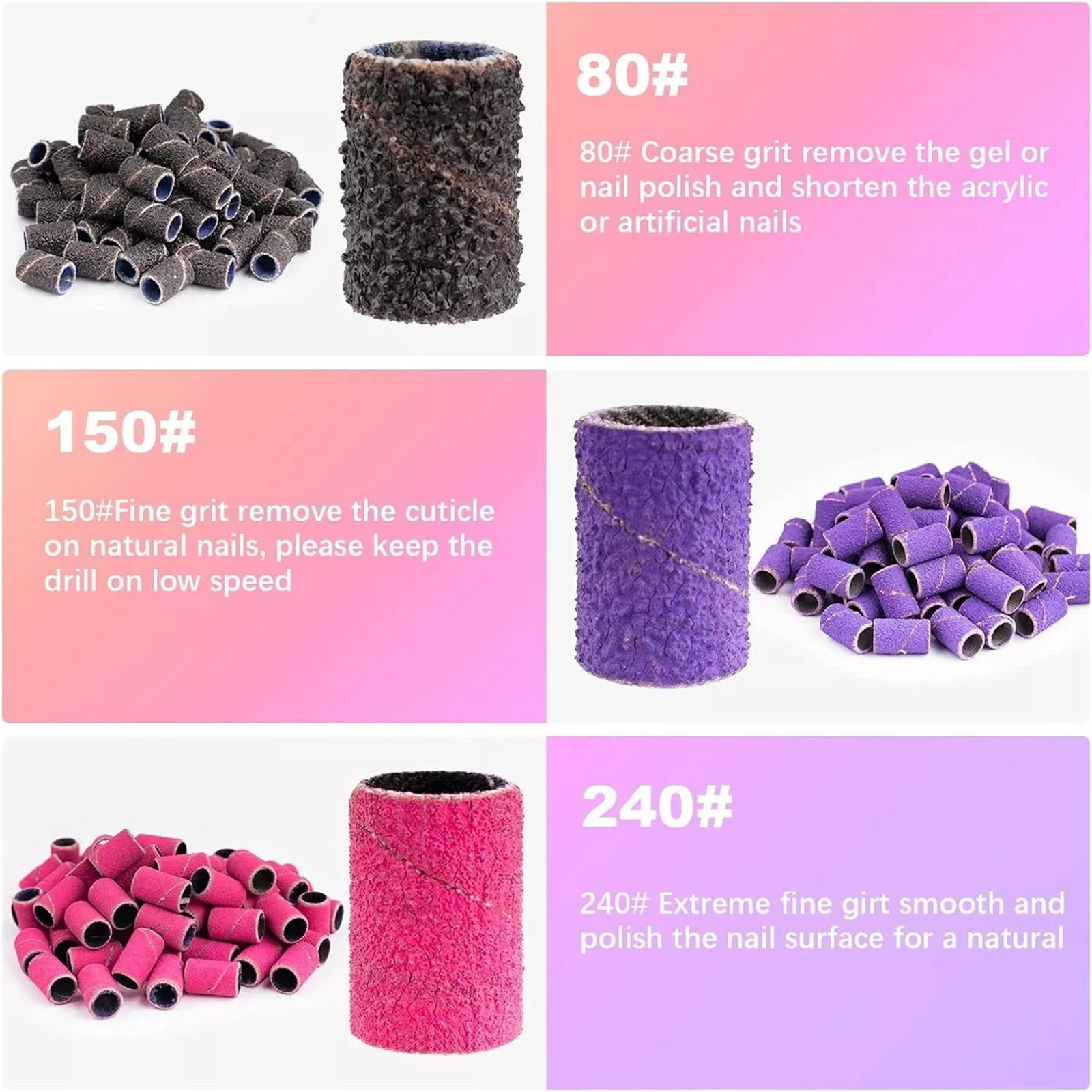 The sanding bands for electric nail file in 3 colors are made of quality sand band durable senior material,that it comes with two nail drill bits and not just one,there are three different grits and they work so handy to take off gel nail polish in a jiffy.