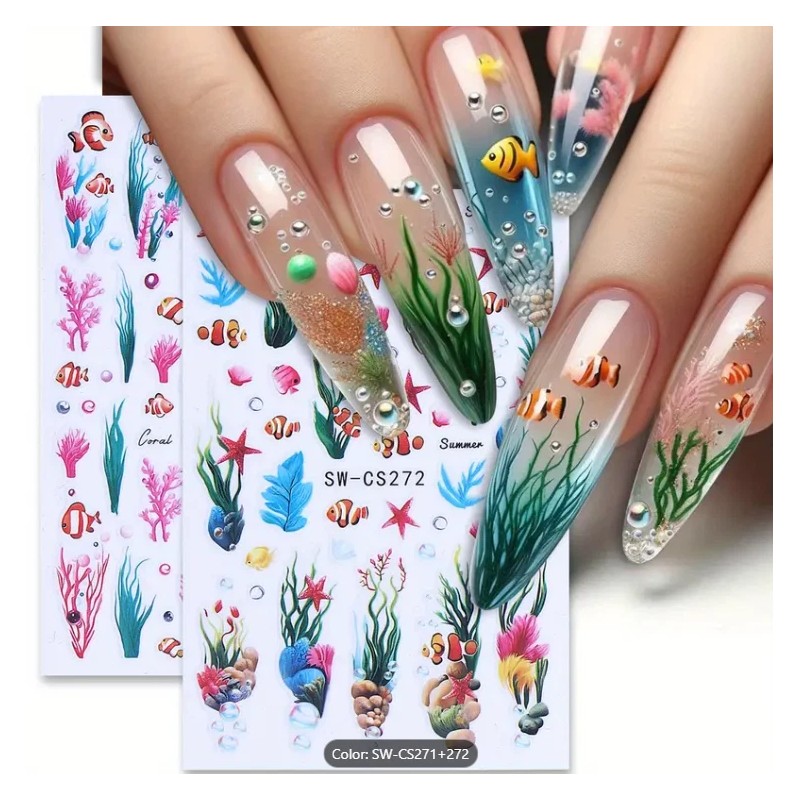 Unbranded 2Pcs Set Nail Stickers Clownfish Seaweed Starfish Ocean Peel Off Decor NH30