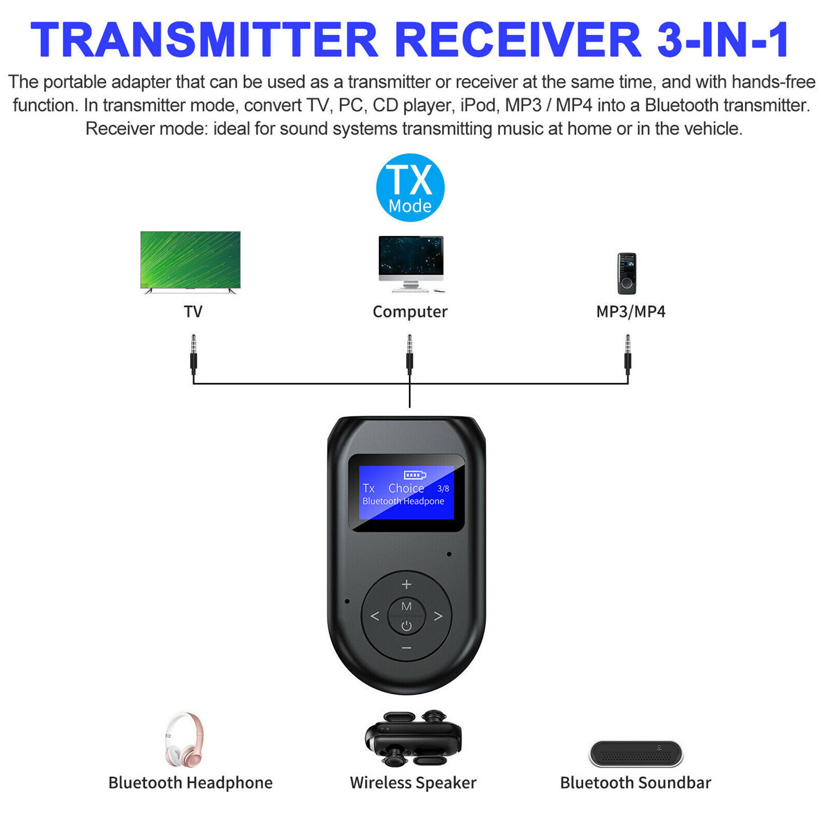Transmitter Receiver 3-In-1: The portable adapter that can be used as a transmitter or receiver at the same time, and with hands-free function. In transmitter mode, convert TV, PC, CD player, iPod, MP3 / MP4 into a Bluetooth transmitter.