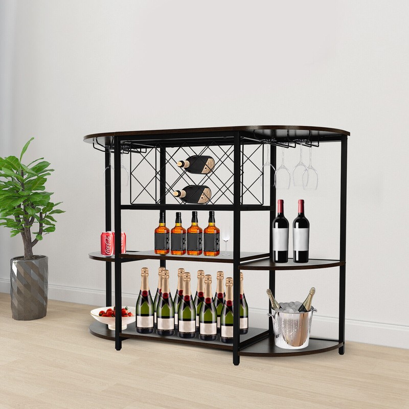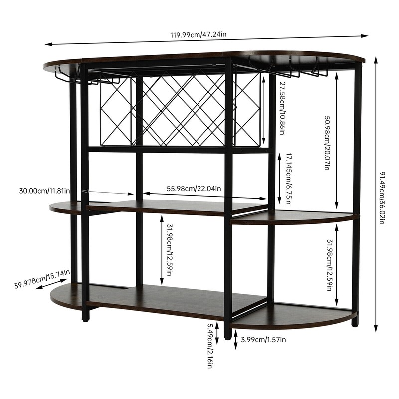 Ample Storage Space: The wine rack table measuring 15.8 *47.5 *36 inches has a 3-tier design, a middle wine bottle rack, and 4 rows of glass holders, which can hold and display your favorite wines and goblets, as well as store your daily supplies to keep your home or bar neat.
