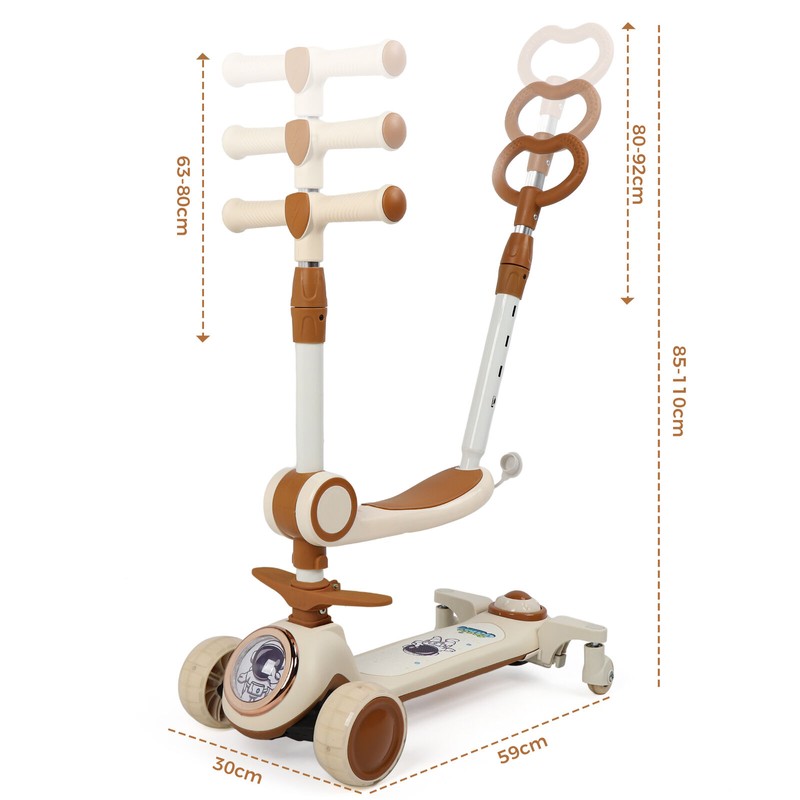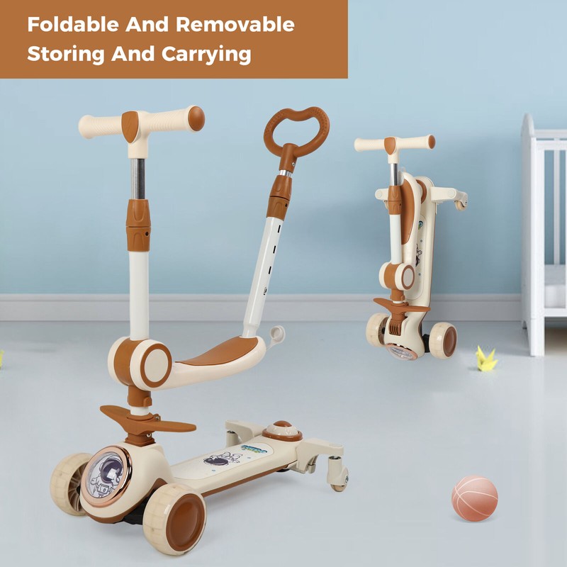 360° Rotating 4-Wheel Children's scooters, 2 in 1 Kids Kick Scooter Adustable Height, Foldable Comfort Seat, Brown