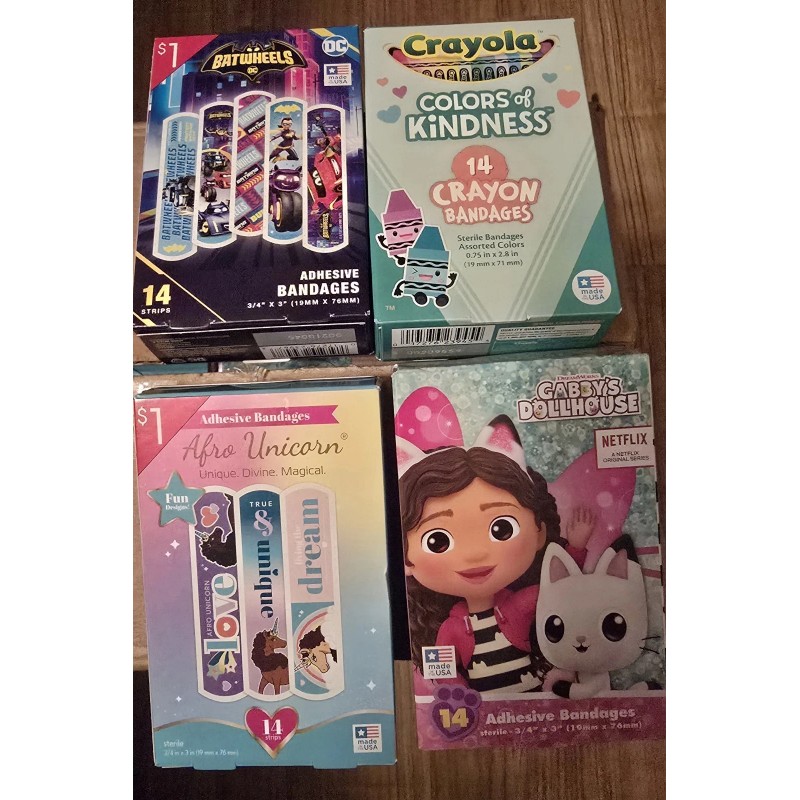4 BOXES BANDAIDS 14 IN EACH BOX. Crayola, Batman, Gabby's dollhouse, and afro unicorn. All new. 14 each box 56 total. Sold as is no returns no personal checks