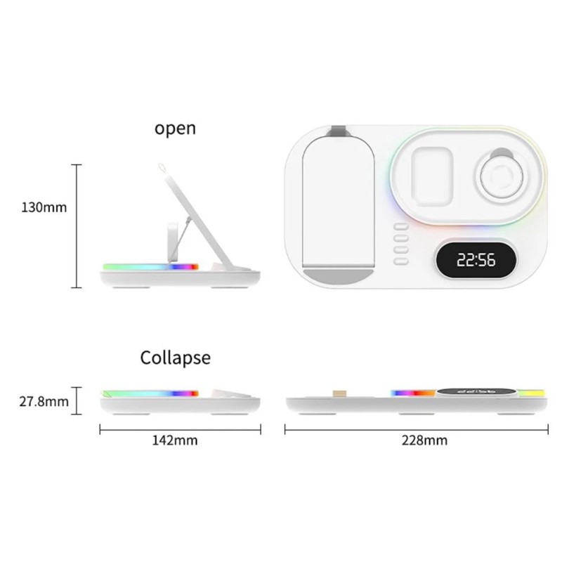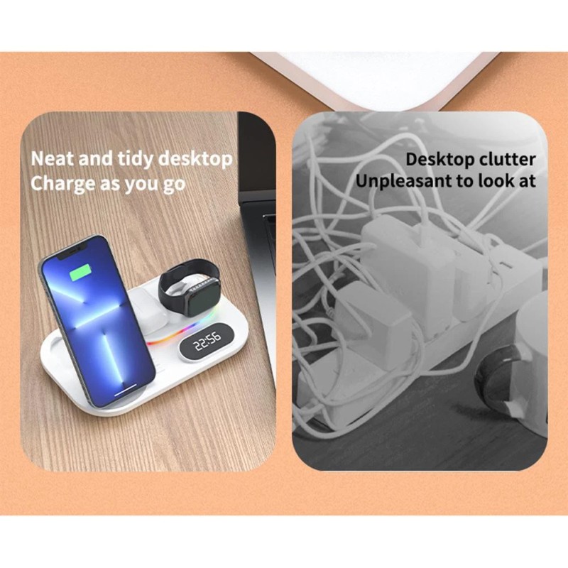 1. 4 in 1 Foldable Wireless Charging Station: Its design allows you to charge /2/3/4/5/6/SE/7, compatible for IOS headset 2/3/Pro other wireless headset and mobile phone wirelessly at the same time, for the best charging experience.