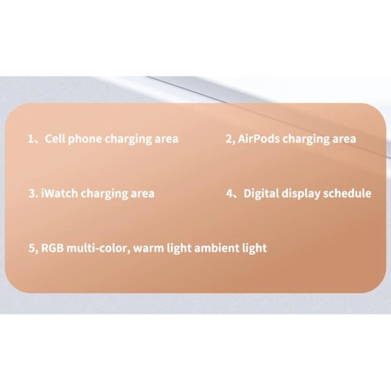 Output power: 30W (wireless charging: 15W, base headset: 3W watch: 3W, USB: 3W)