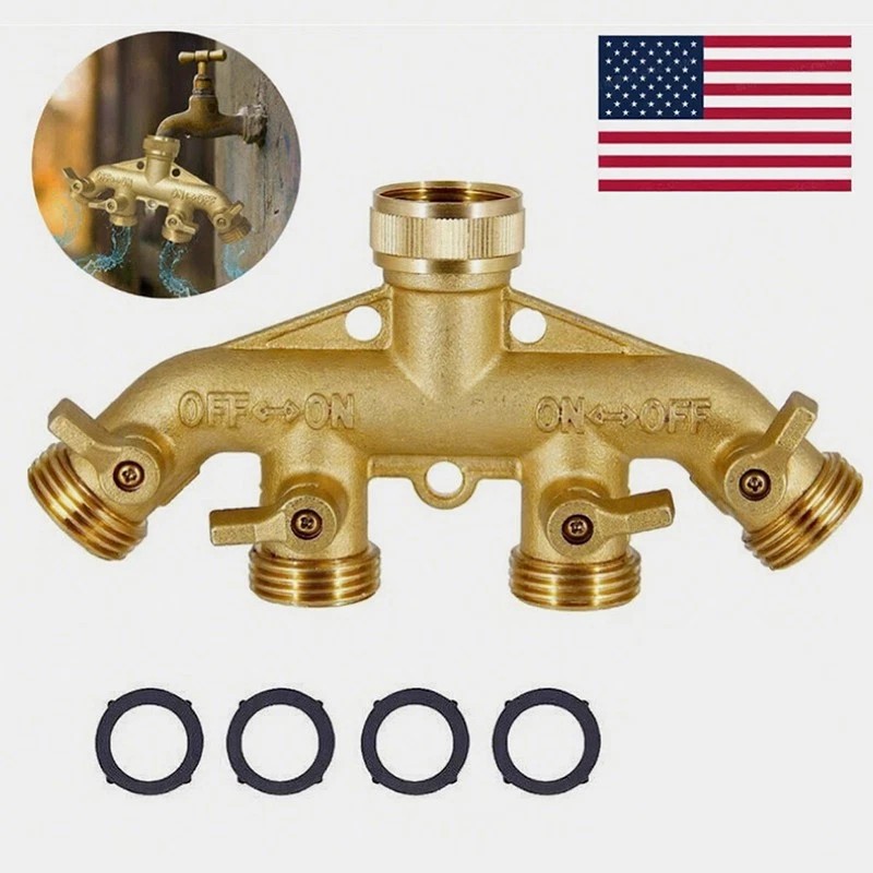Unbranded 4 Way Brass Hose Splitter, 3/4" Brass Hose Faucet Manifold, Garden Hose Adapter