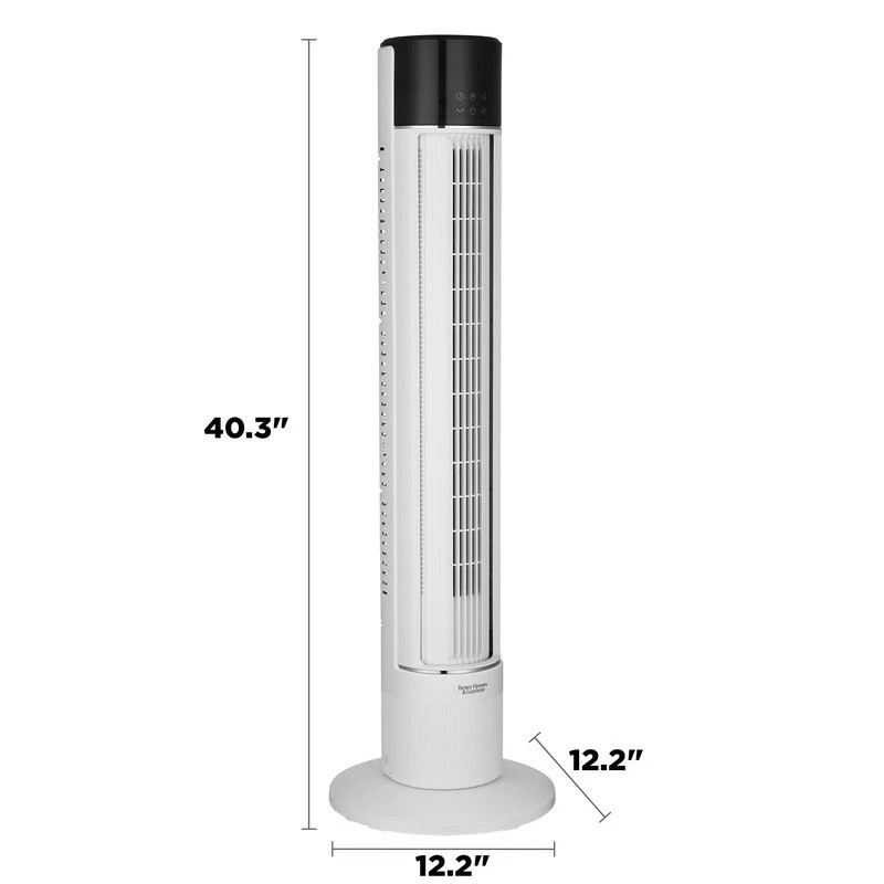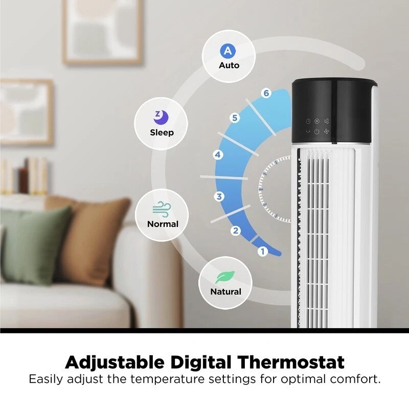 Enhance your home’s comfort with the  40" Tower Fan in white.  This stylish and sleek fan complements any home décor while providing powerful cooling.  Key features include an 8-hour timer, adjustable digital thermostat, remote control, and an easy-to-read LED display.  Perfect for maintaining a comfortable environment, this tower fan combines functionality with modern design to suit your lifestyle.