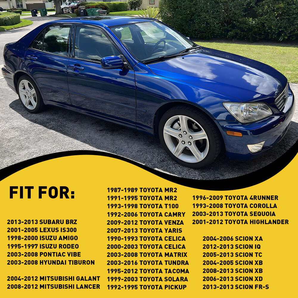 1987-1989 Toyota MR2 1991-1995 Toyota MR2 1993-1998 Toyota T100 1992-2006 Toyota Camry 2009-2012 Toyota Venza 2007-2013 Toyota Yaris 1990-1993 Toyota Celica 2000-2003 Toyota Celica 2003-2008 Toyota Matrix 2003-2016 Toyota Tundra 1995-2012 Toyota Tacoma 1999-2003 Toyota Solara 1992-1995 Toyota Pickup 1996-2009 Toyota 4Runner 1993-2008 Toyota Corolla 2003-2013 Toyota Sequoia 2001-2012 Toyota Highlander