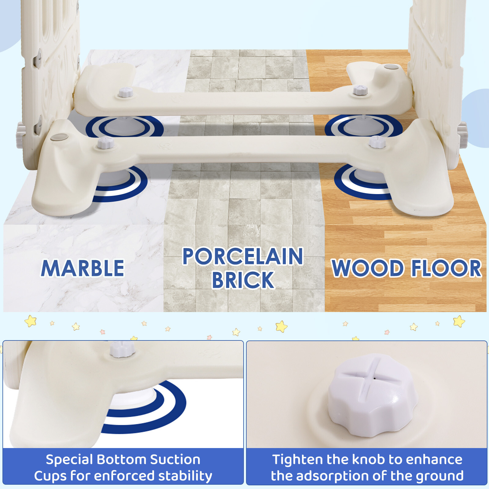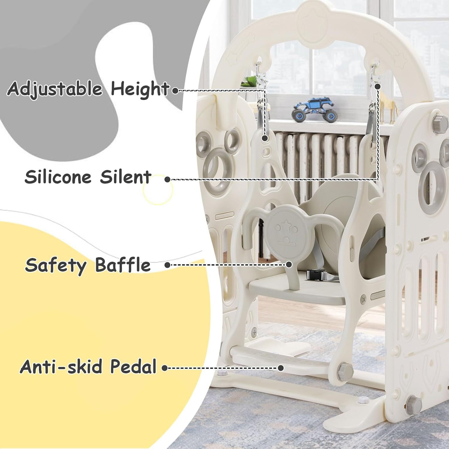 - INNOVATIVE REINFORCED SWING - Swing is a part that kids can't stop, we have specially upgraded for better function and stability. The swing base is equipped with 4 suction cups, which can be adsorbed on a flat ground surface to prevent accidental dumping. The swing armrests are connected with metal buckles with a silicone pad to eliminate rattling and enhance durability.