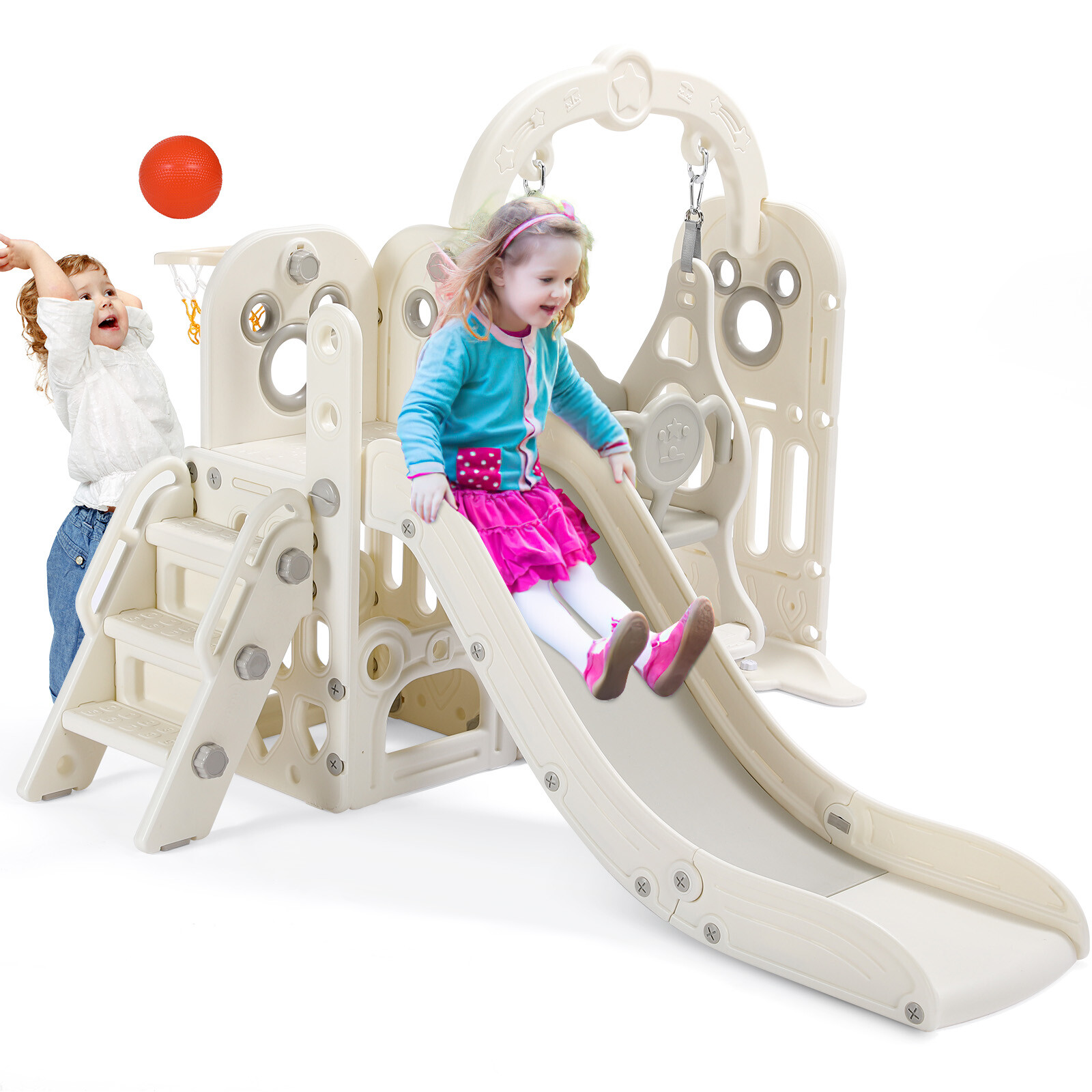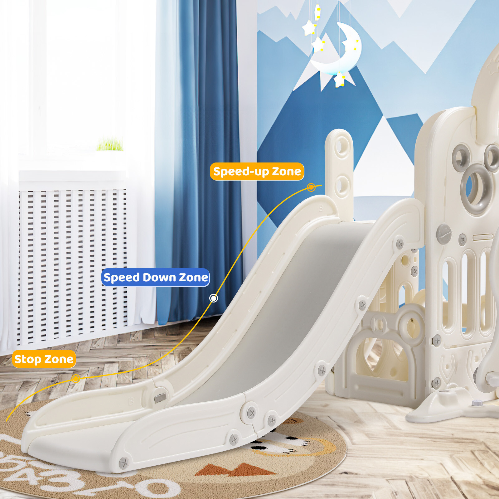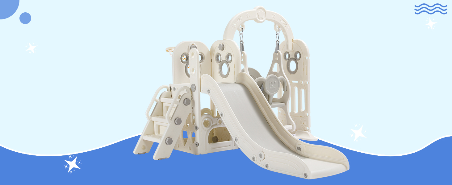 - 5 IN 1 ACTIVITY CENTER - The adorable indoor baby slide features 5 activity areas, including climber, slide, swing, shooting hoop and storage space. By swinging, climbing, sliding and jumping, baby develops coordination and a sense of adventure as they play. Also help improve gross motor skills keeping physical fitness and expending excess energy.