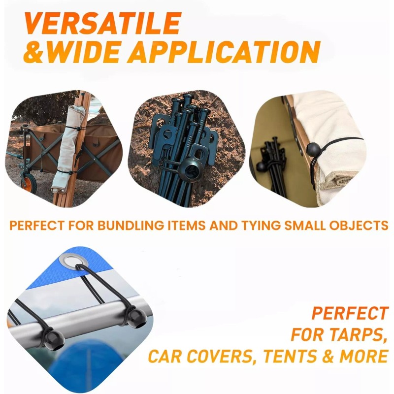 MULTIPLE USE: Our ball bungee cords can be widely used in a variety of indoor and outdoor situations to fix small objects, as Canopy, Tarp, Straps, Tent, motor homes, camping, poles and wires, for incredible dependability.