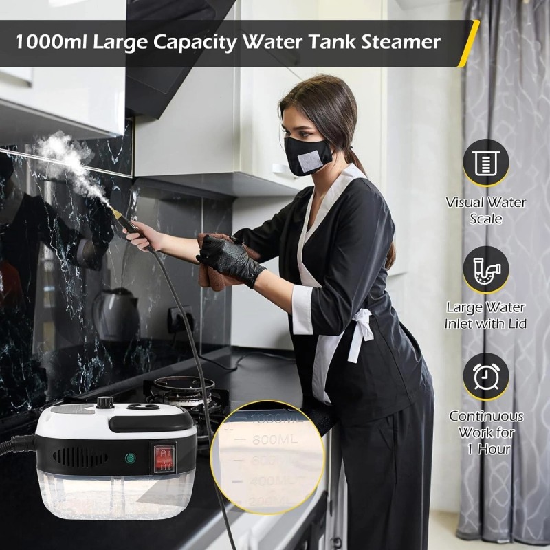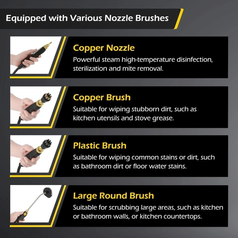 [High Temperature & Pressure Steam] 2500W high power can generate 229°F/105°C high temperature and 3BAR pressure steam within 10s, effectively remove stubborn greasy dirt and stains.
