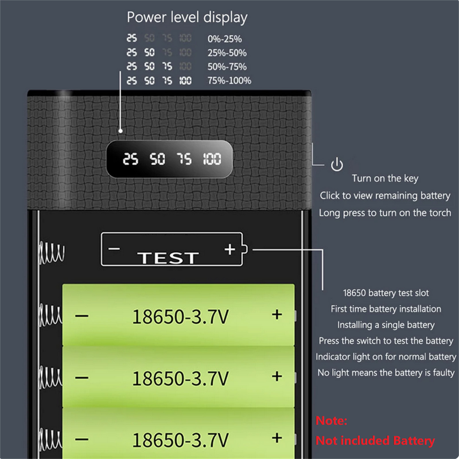 3. Intelligent 18650 battery charger: Compatible with flat and pointed 18650 rechargeable lithium batteries (flat 6.5cm, pointed 6.7cm, pointed+protective plate 6.9cm). Each battery slot is charged and tested separately. When the battery is fully charged, it will automatically stop charging. (Note: Please pay attention to the positive and negative pole)