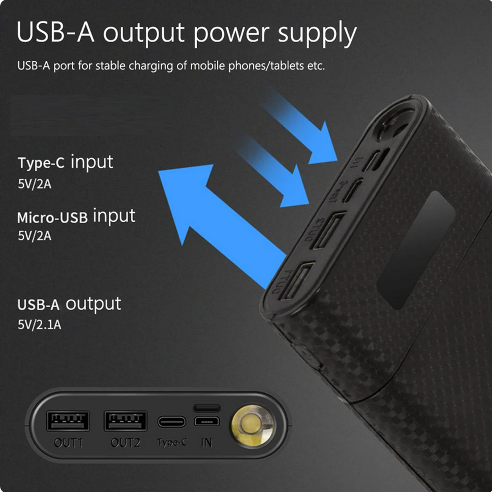 1. DIY mobile power box: Large capacity, 8 x 18650 batteries (batteries are not included). Dual USB mobile power supply, two devices can be charged at the same time. Three input ports: Micro, Type-C, for iPhone, compatible with three commonly used mobile phone/ tablet interfaces.