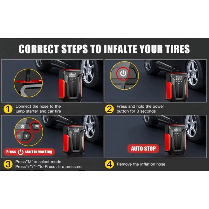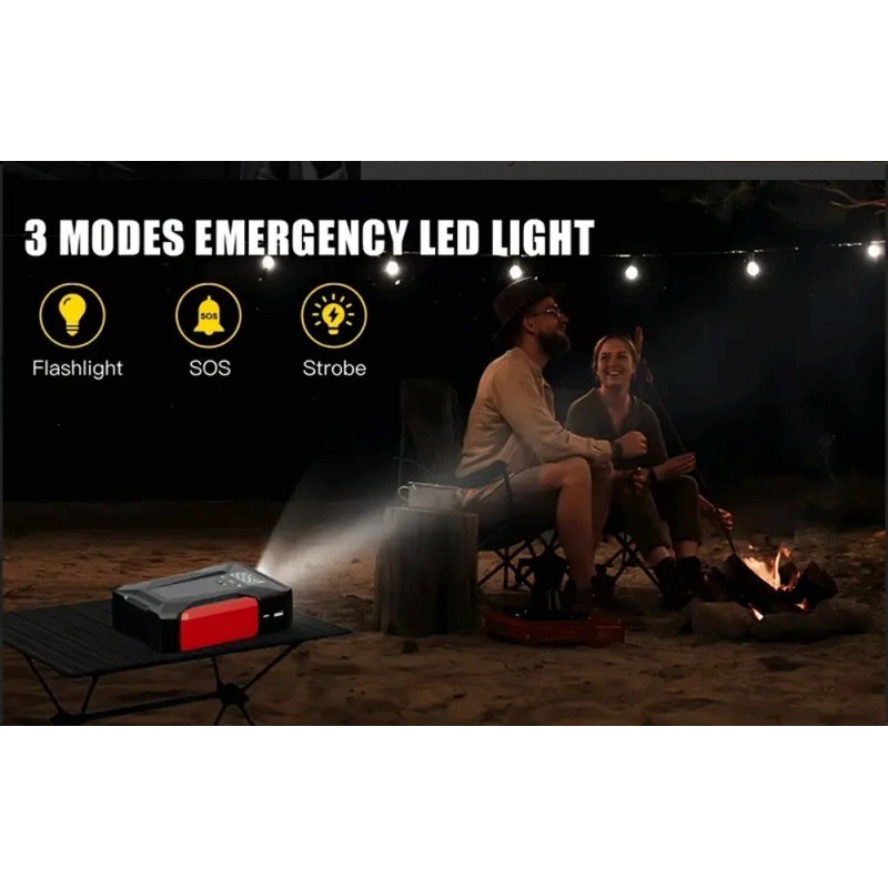 - 8-IN-1 JUMP STARTER: Not only is it a car jump starter, it can also be used as a pump, portable battery pack, emergency LED light with 3 modes (flashlight, SOS, strobe) and power bank to charge mobile phones, tablets and other USB devices. hard press power button 3 seconds to turn on.