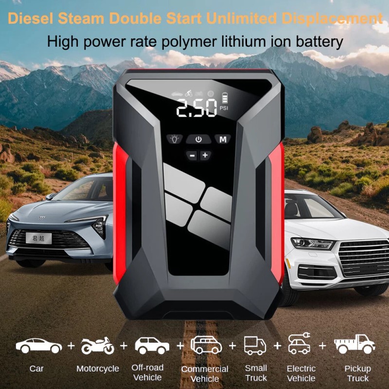 - INFLATION FUNCTION: The car battery jump starter is equipped with tire inflation and 3 types nozzles, supporting 3 optional units (PSI, BAR, KPA), which can inflate various tires and balls. In addition, there are smart screen and tire pressure detection function.