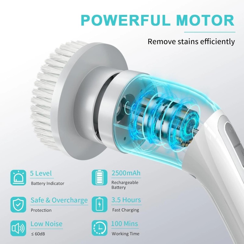 【 & 】 Powered by 1800 mAh rechargeable battery, the electric scrubber after 3.5 hours of fast charging is available to work for up to 90 minutes. The shower scrubber for cleaning with 5 level battery display allows you to view the dump battery and able to recharge it in time. Thanks to the feature of waterproof IPX5, so there is no worry about malfunction due to ingress of water.