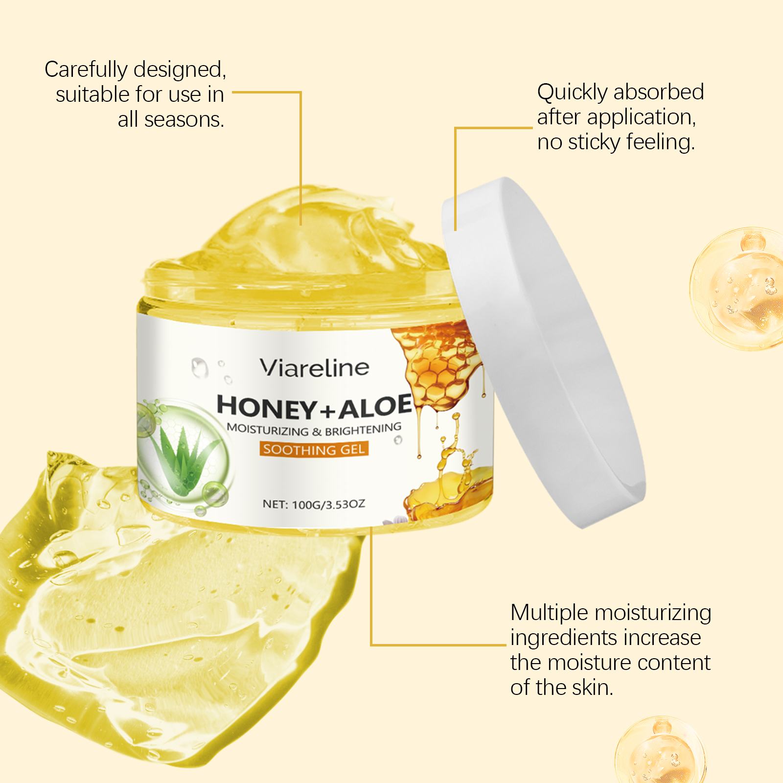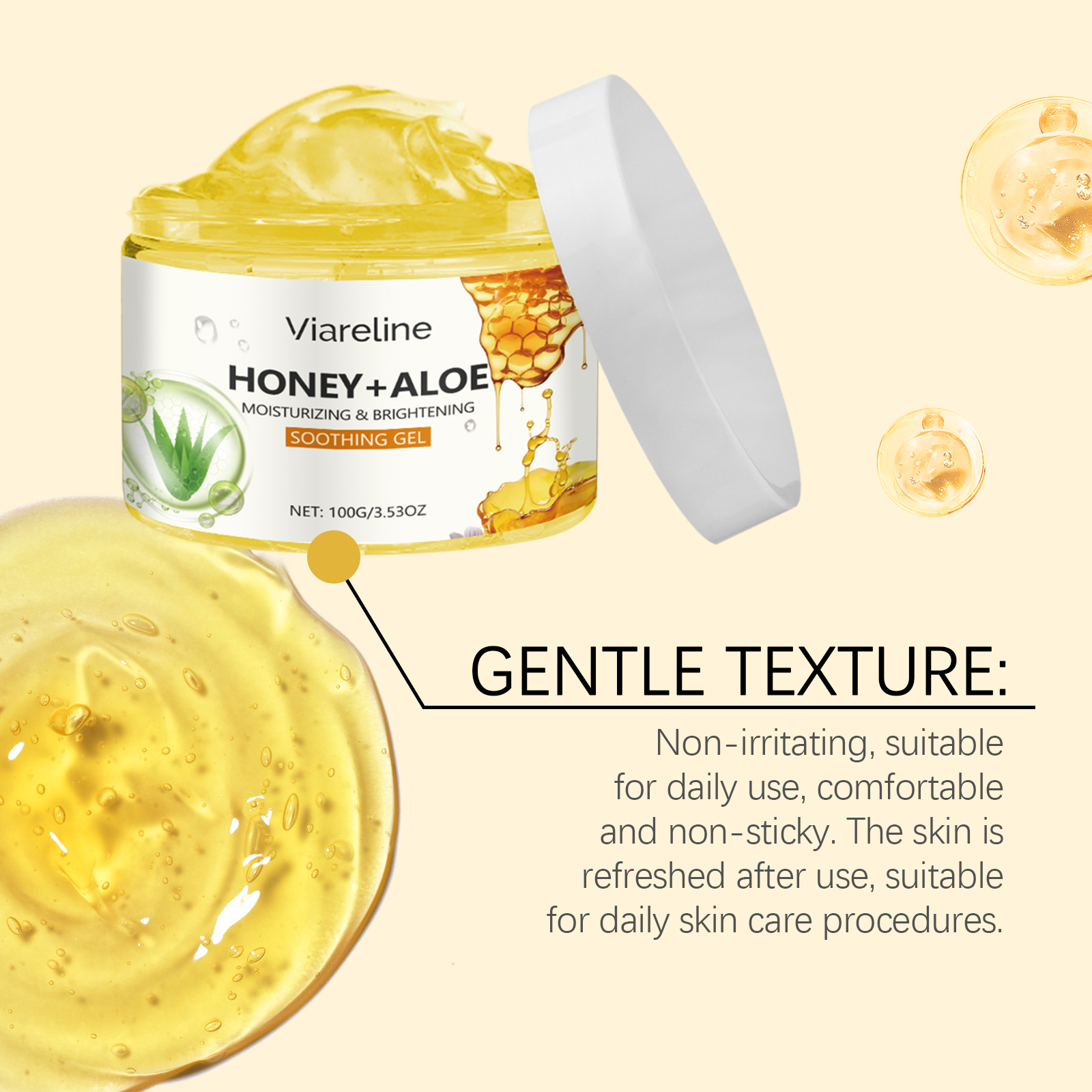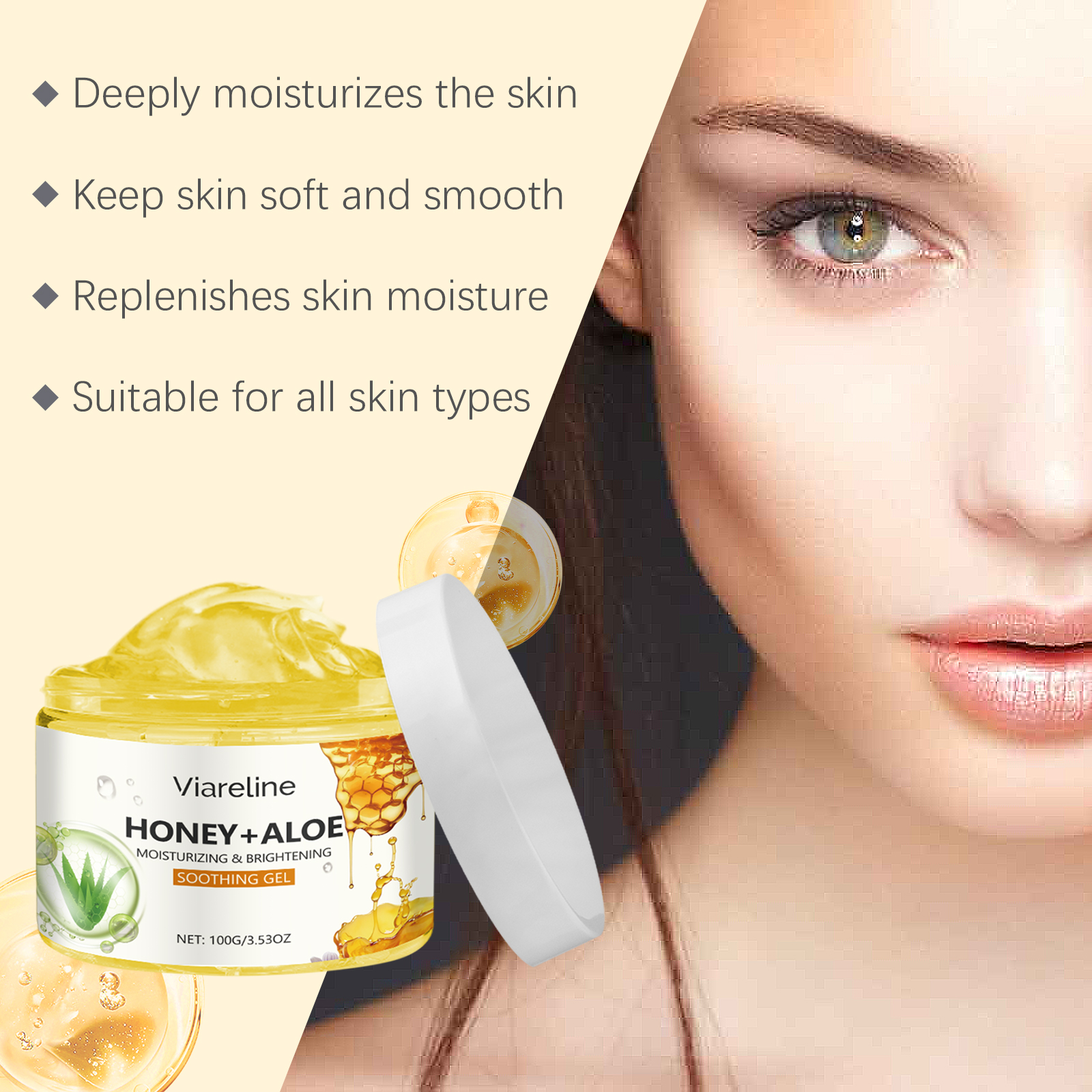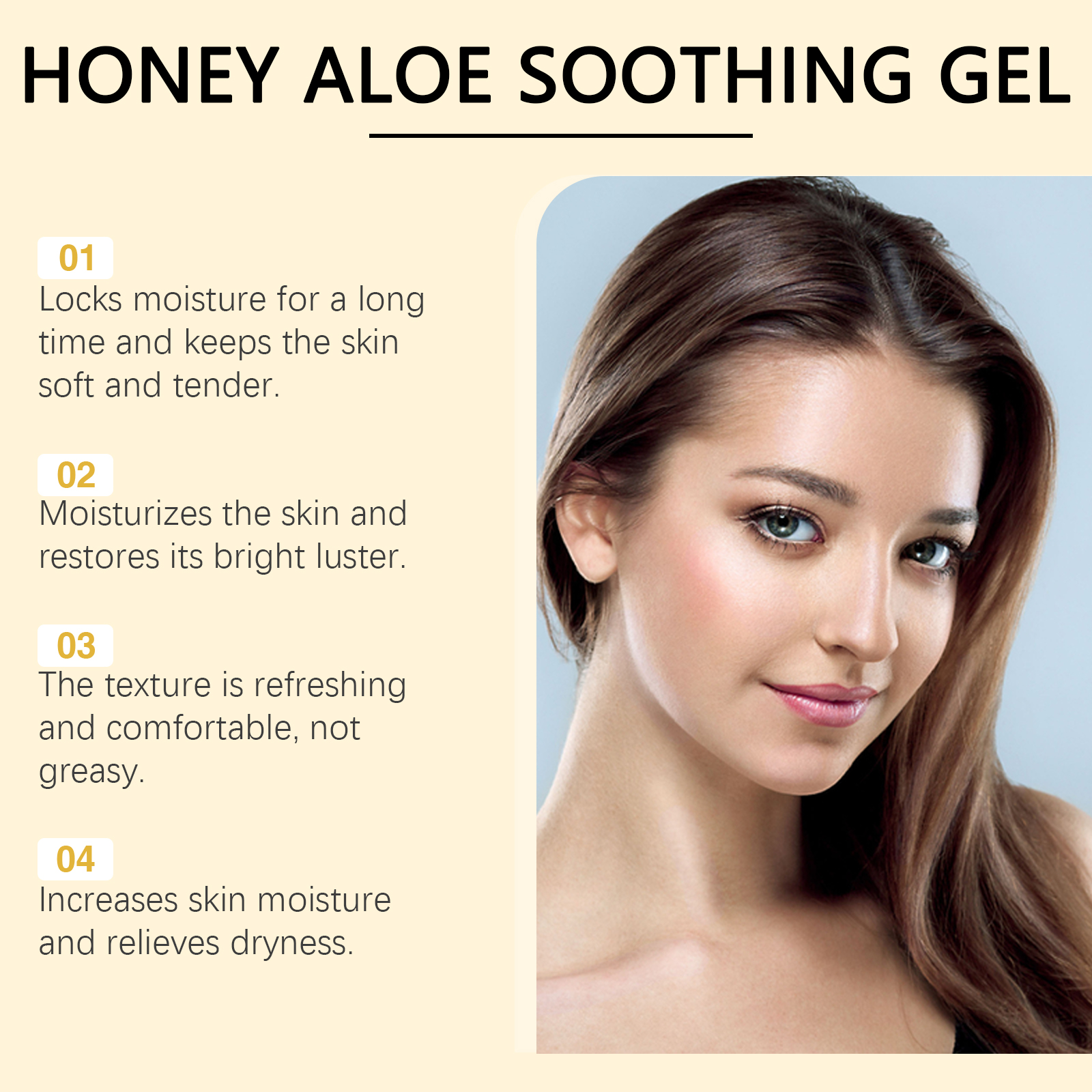 Our aloe honey moisturizing gel contains glycerin and aloe extract. It is easy to use and gives a refreshing, moist texture for all skin types. Relieve dryness and discomfort, improve skin moisture. Helps to lock in moisture, keeping skin soft and smooth, leaving skin more hydrated and shiny after application. Its application is simple: clean your face and keep it dry. Apply appropriate amount to face evenly. Gently massage until absorbed. And can be used continuously, the skin feels softer and smoother. The formula is refreshing, non-greasy and suitable for all skin types.