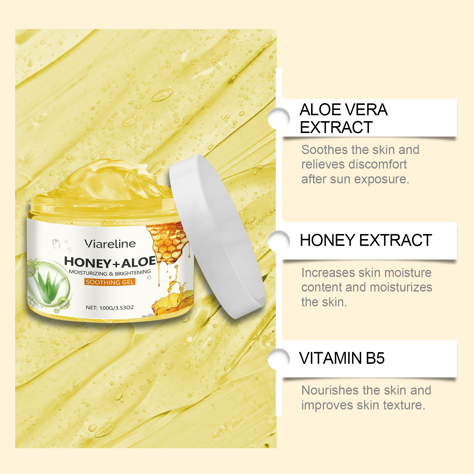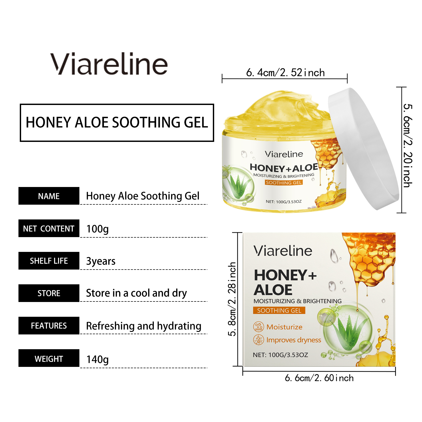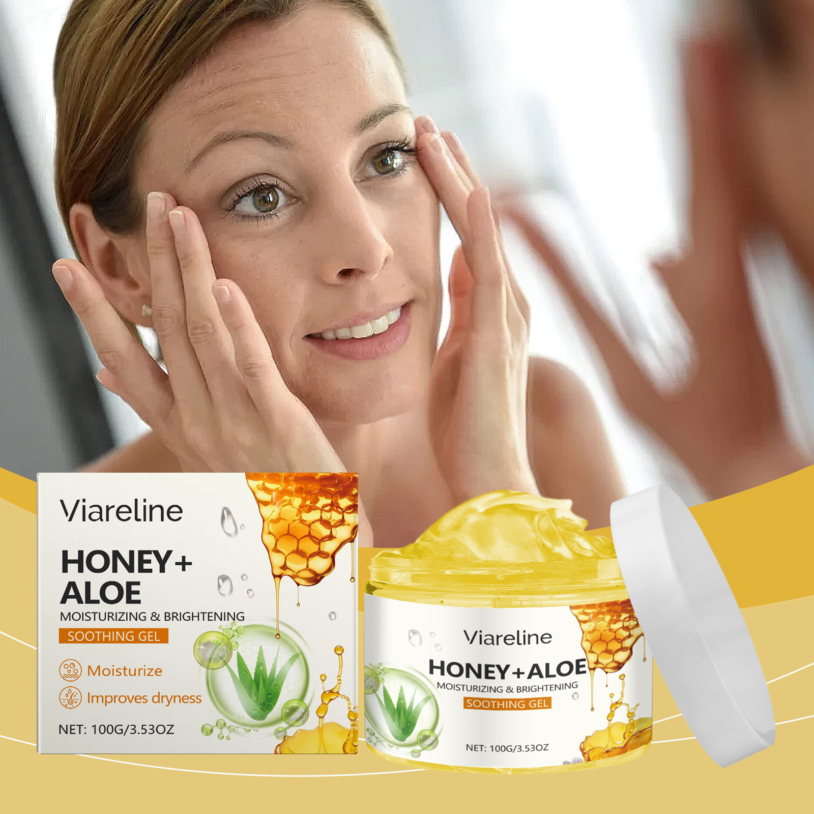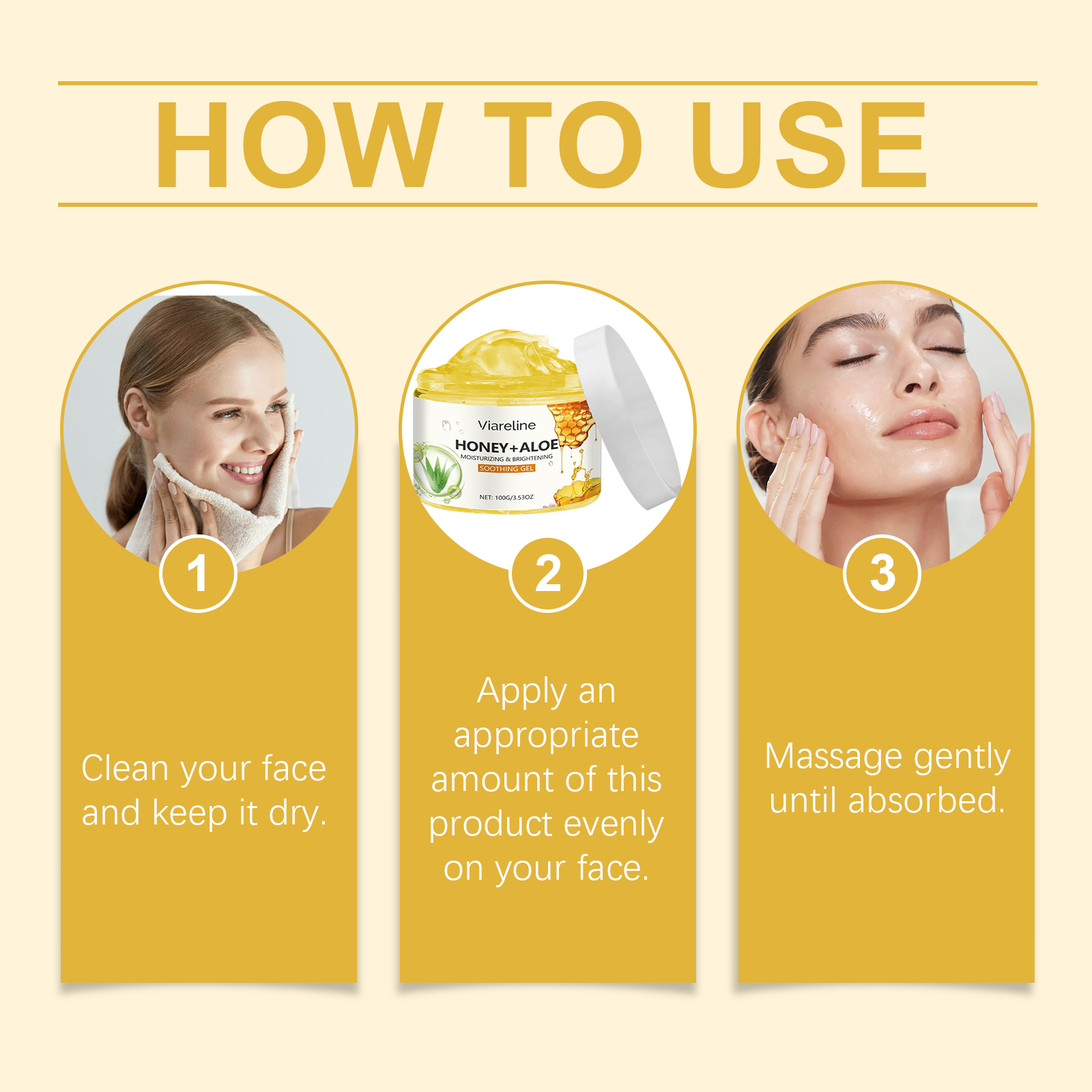 Our aloe honey moisturizing gel contains glycerin and aloe extract. It is easy to use and gives a refreshing, moist texture for all skin types. Relieve dryness and discomfort, improve skin moisture. Helps to lock in moisture, keeping skin soft and smooth, leaving skin more hydrated and shiny after application. Its application is simple: clean your face and keep it dry. Apply appropriate amount to face evenly. Gently massage until absorbed. And can be used continuously, the skin feels softer and smoother. The formula is refreshing, non-greasy and suitable for all skin types.