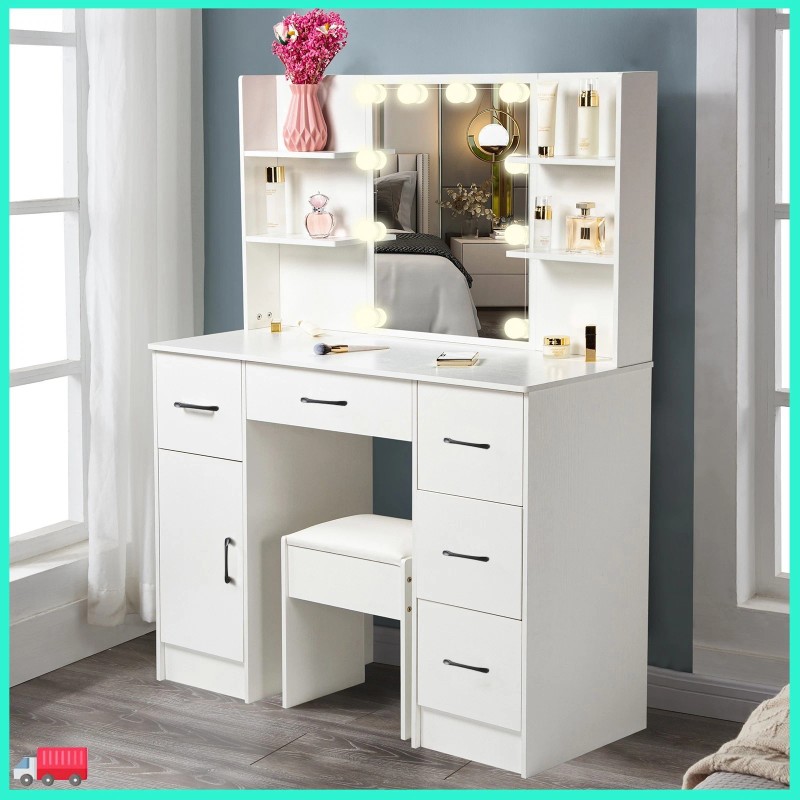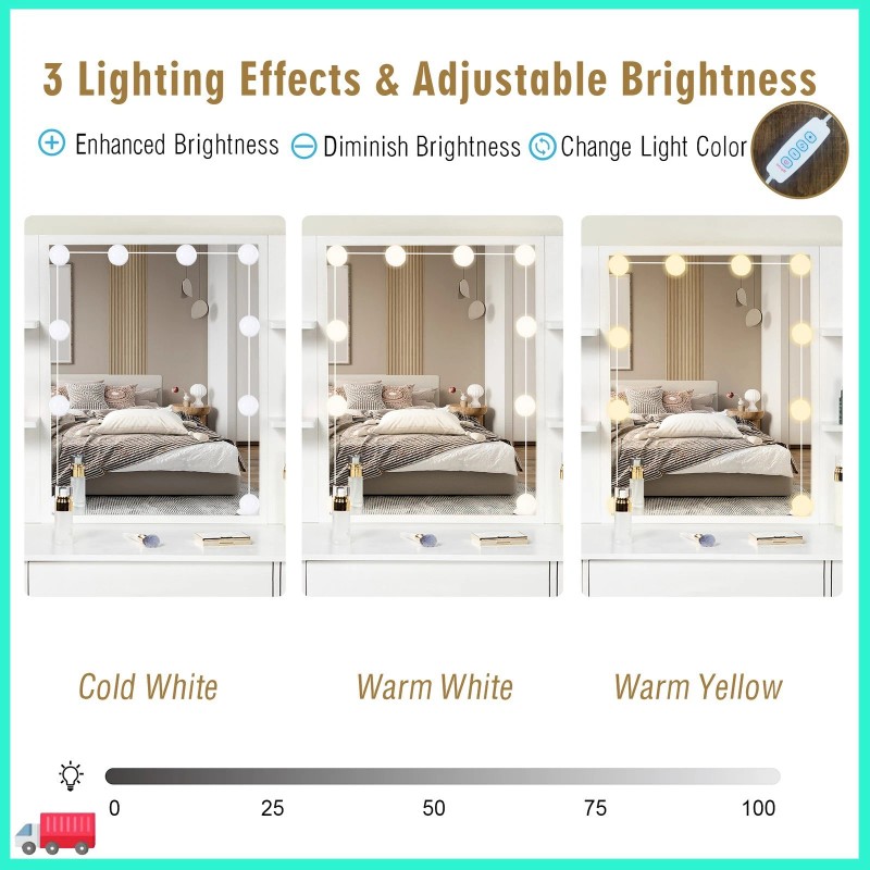 【COLOR & BRIGHTNESS ADJUSTABLE LIGHT】 Equipped with the 10-bulb Light, this vanity set provides you with super-bright lighting conditions, giving you the makeup environment of Hollywood dressing rooms. The light is brightness adjustable, with 3 different color moods(warm yellow, warm white, cold white), so you can choose the brightness to meet your needs.