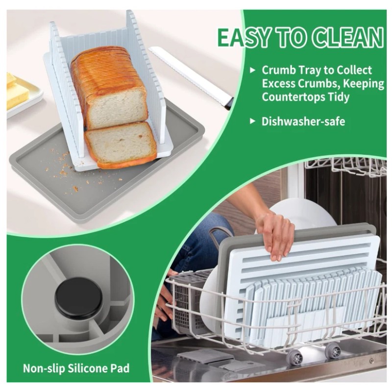 Multifunctional Crumb Tray: The integrated tray catches all crumbs, keeping your countertop clean, and doubles as a serving plate for bread or snacks. The bread loaf slicer is dishwasher safe for easy cleanup.