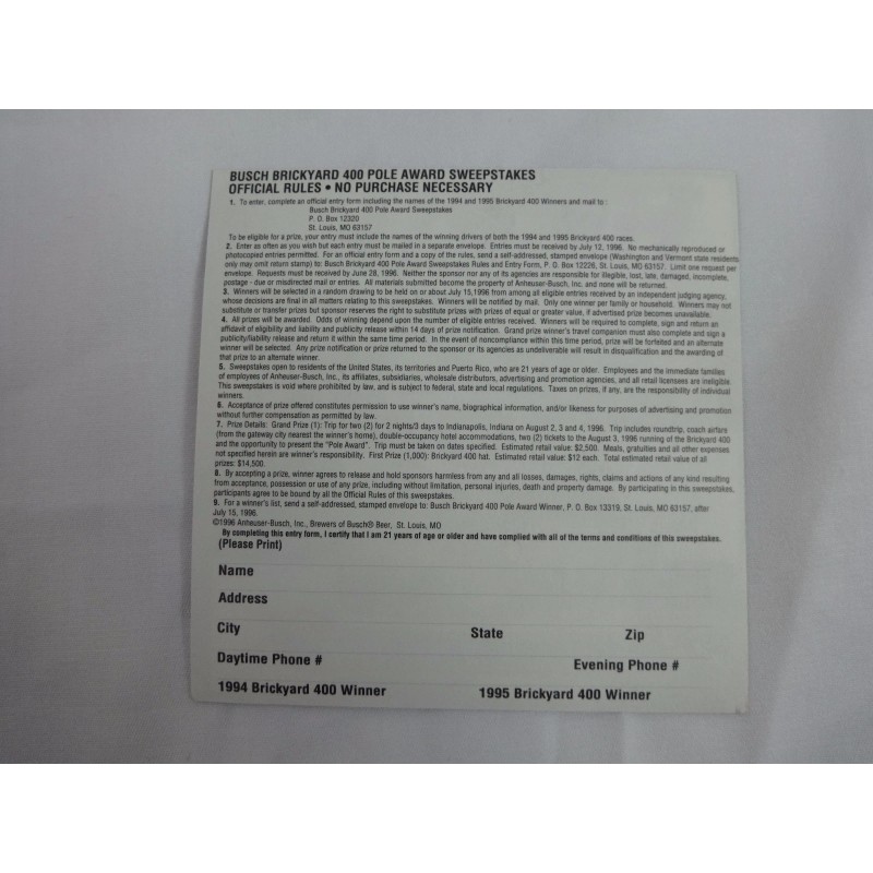 Unbranded Busch Beer Pole Award 1996 Brickyard 400 Event Collector Static Cling Decal
