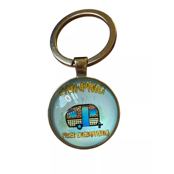 Unbranded “Camping Fixes Everything” Small Silver Round Dome Backed Keychain
