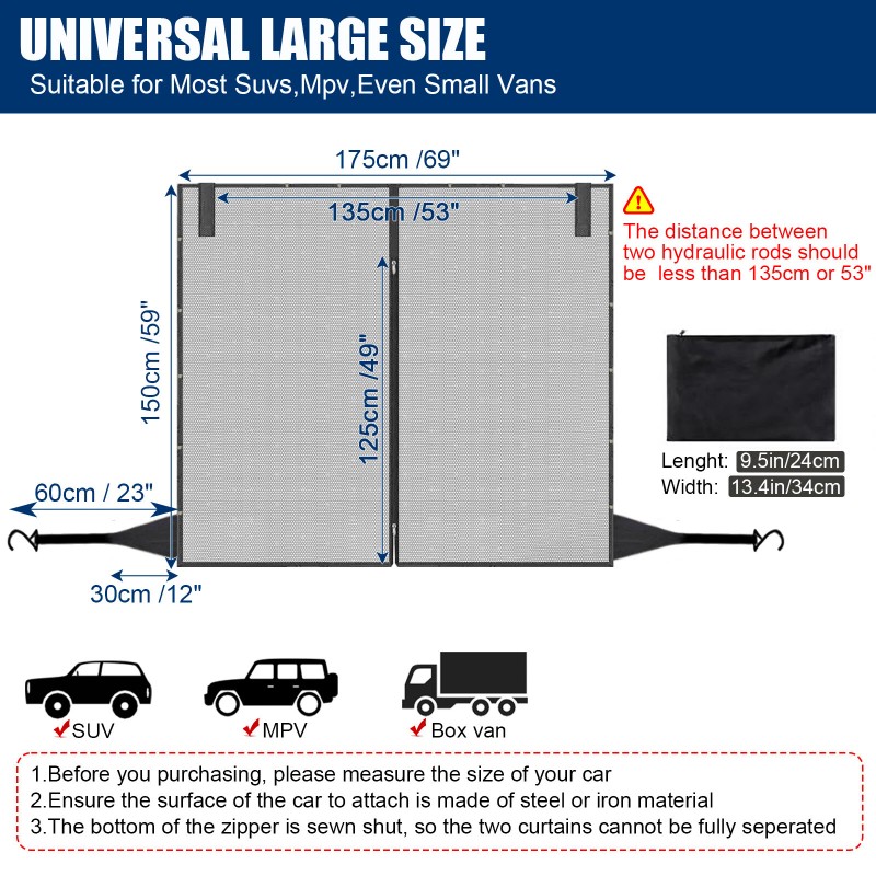 [Easy to Install] The car mosquito screen is very easy to install and remove. Just fix the two mounting straps to the trunk hydraulic rod, fix the magnets to the car body, and then install the fixing hooks on the tire to complete the installation.