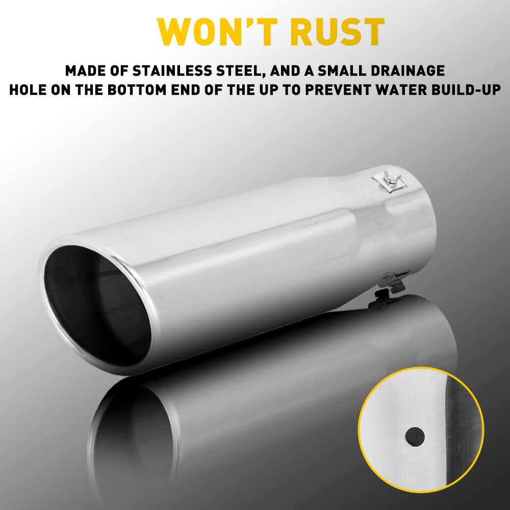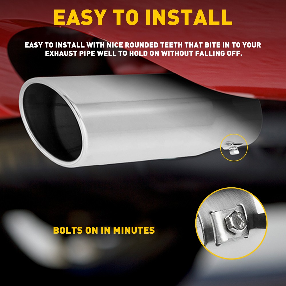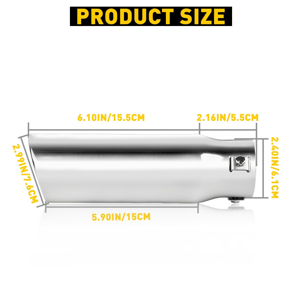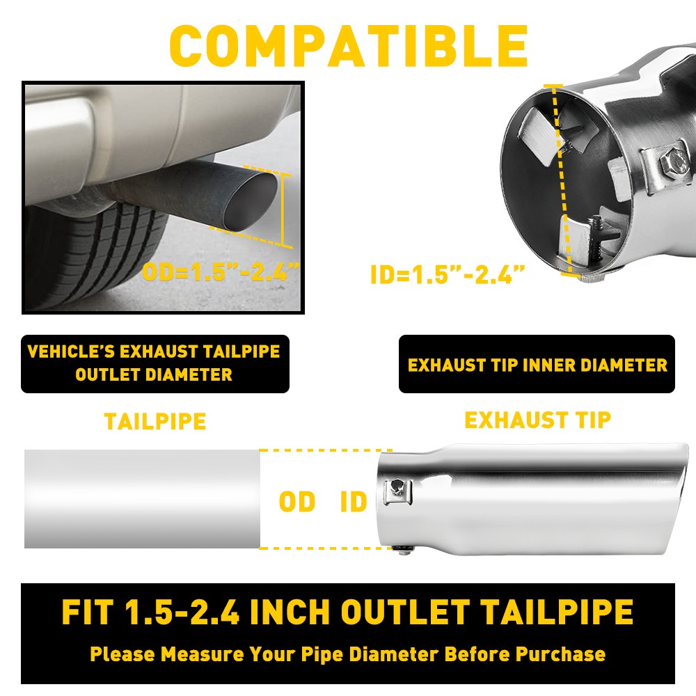 1.Please measure the outside diameter of your exhaust pipe before purchase, otherwise our product will not fit your car. This tips fit only 1.5-2.4 inch outlet tailpipe