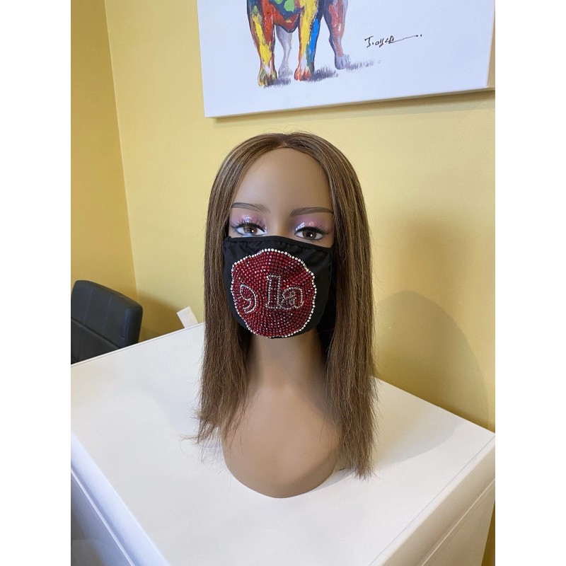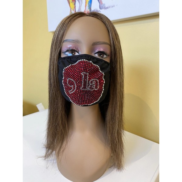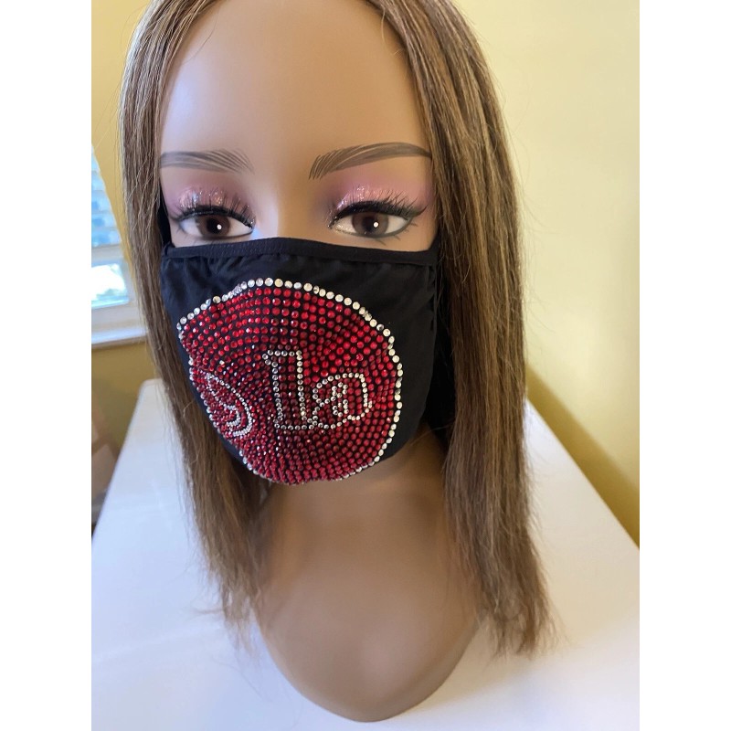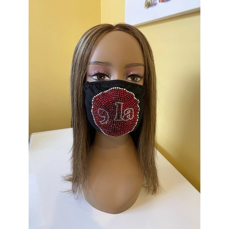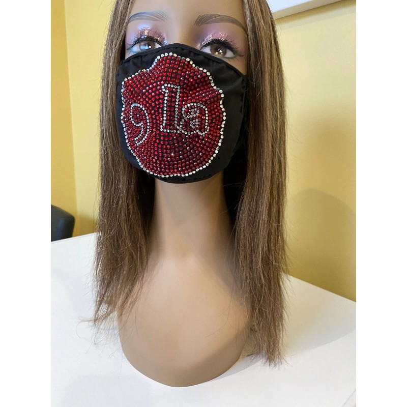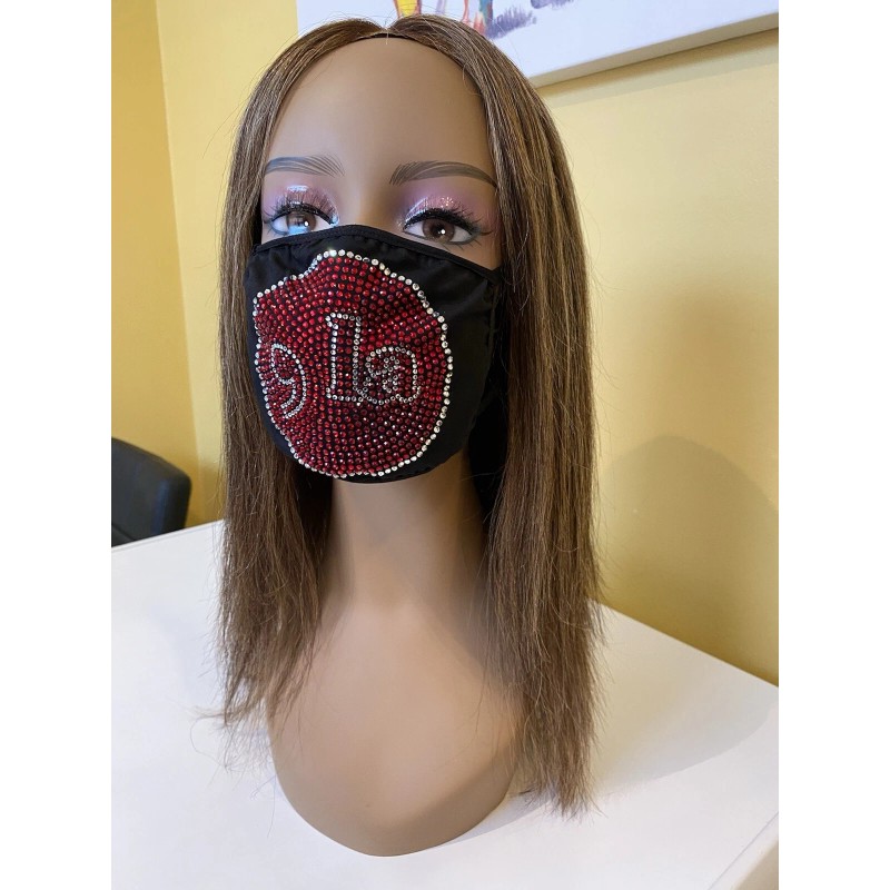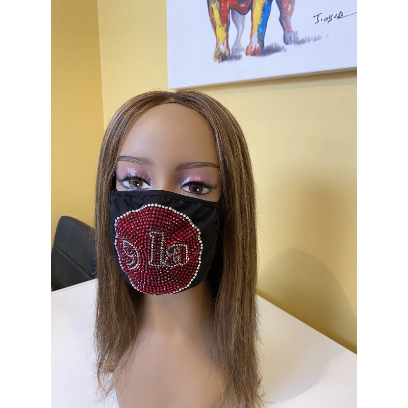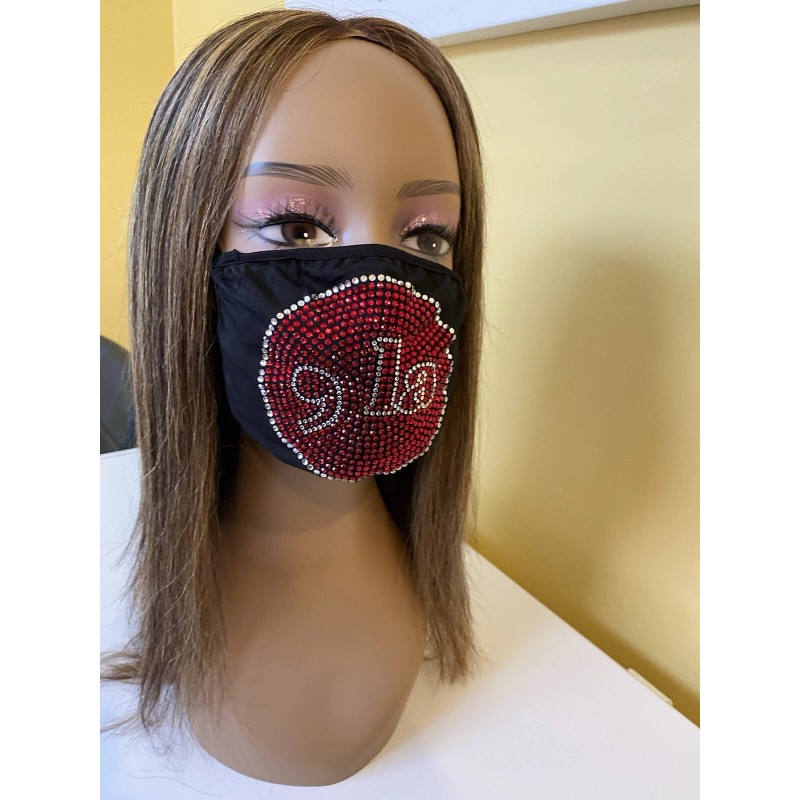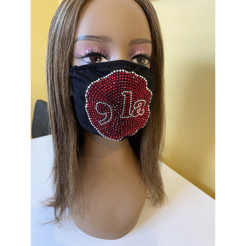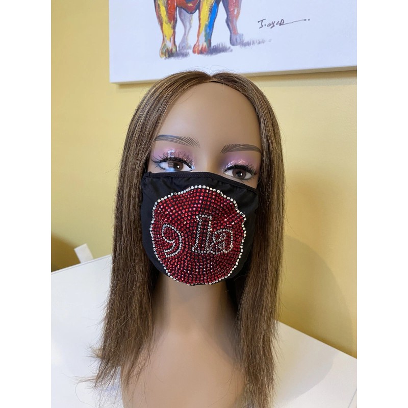 Show support for Kamala Harris. Beautiful yet practical. Made in Delta Sigma Theta colors Red and crystal clear accent rhinestones on a comfortable black face mask.