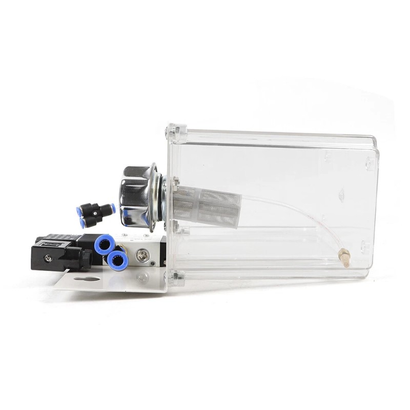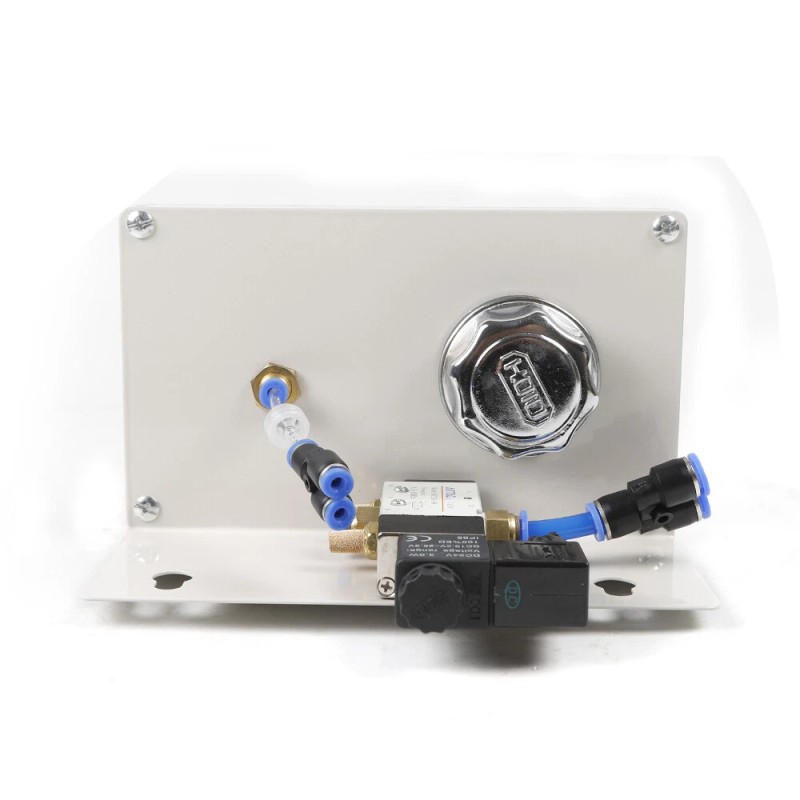 2. The complimentary blue gas pipe should be plugged into the AIR inlet connected to the sprayer from the end of the solenoid valve with a plug. One end of the complimentary transparent tubing is connected to the check valve on the tank and the other end is inserted directly into the OIL suction port of the sprayer.