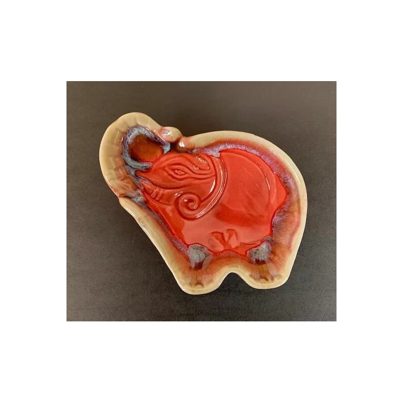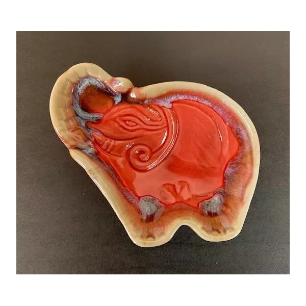 A beautiful glazed ceramic dish in the shape of a baby elephant and in a two-tone coral color. Measures 3” tall by 4” wide.